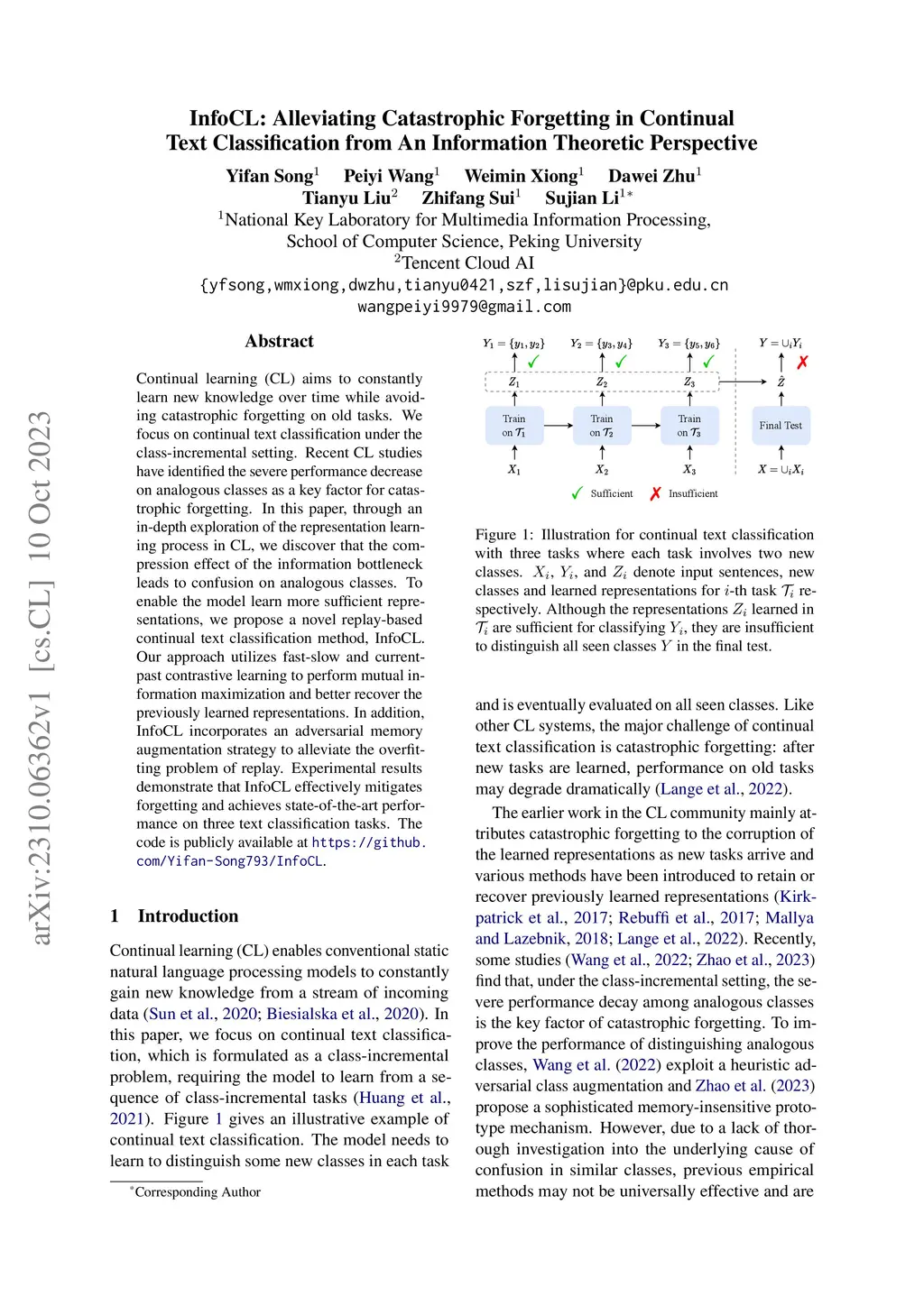 InfoCL: Alleviating Catastrophic Forgetting in Continual Text