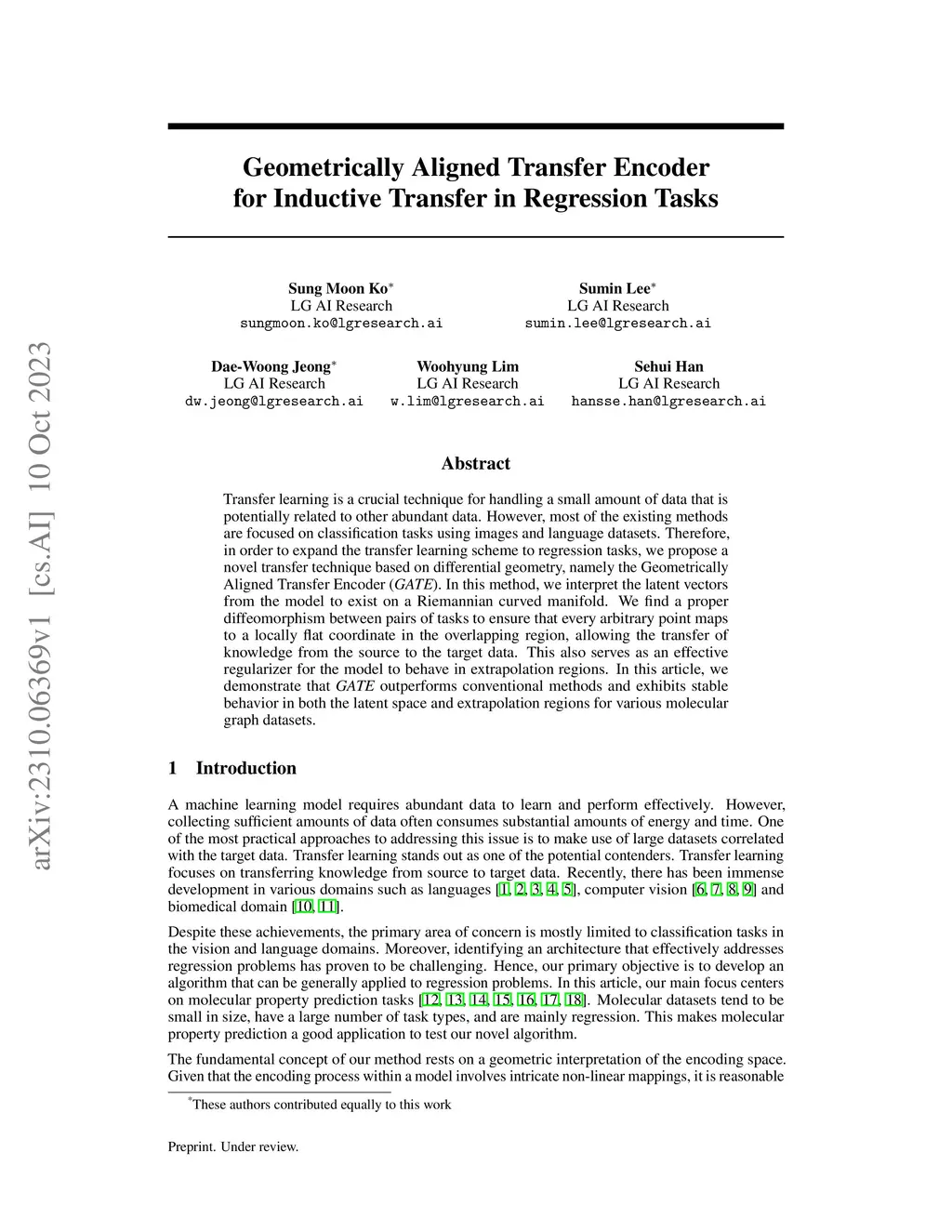 Transfer learning is a crucial technique for handling a small amount of data that is potentially related to other abundant data. However, most of the existing methods are focused on classification tasks using images and language datasets. Therefore, in order to expand the transfer learning scheme to regression tasks, we propose a novel transfer technique based on differential geometry, namely the Geometrically Aligned Transfer Encoder (GATE). In this method, we interpret the latent vectors from the model to exist on a Riemannian curved manifold. We find a proper diffeomorphism between pairs of tasks to ensure that every arbitrary point maps to a locally flat coordinate in the overlapping region, allowing the transfer of knowledge from the source to the target data. This also serves as an effective regularizer for the model to behave in extrapolation regions. In this article, we demonstrate that GATE outperforms conventional methods and exhibits stable behavior in both the latent space and extrapolation regions for various molecular graph datasets.