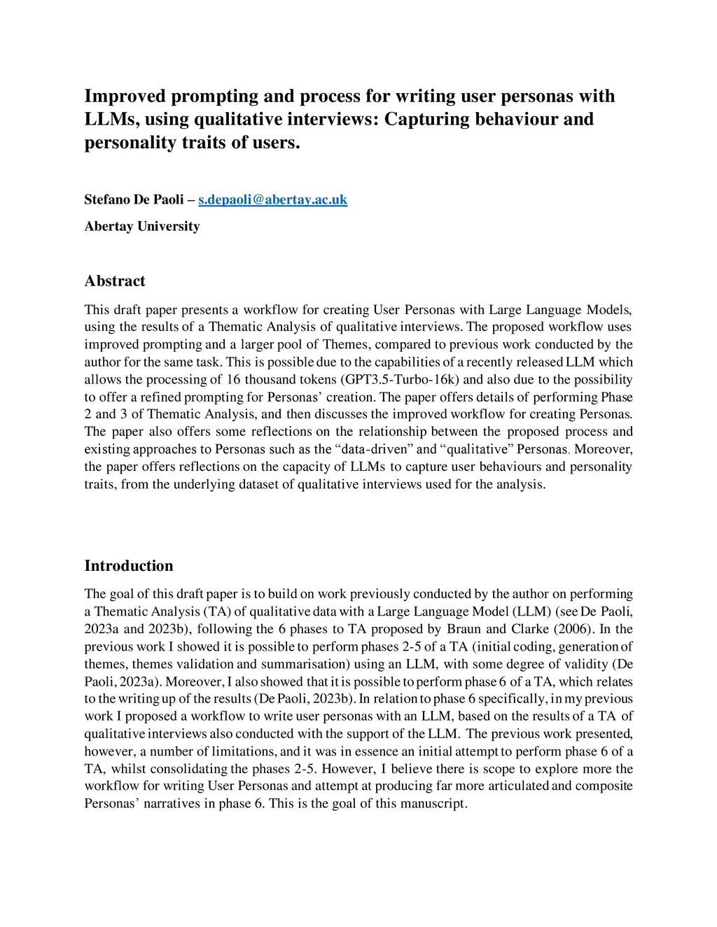 This draft paper presents a workflow for creating User Personas with Large Language Models, using the results of a Thematic Analysis of qualitative interviews. The proposed workflow uses improved prompting and a larger pool of Themes, compared to previous work conducted by the author for the same task. This is possible due to the capabilities of a recently released LLM which allows the processing of 16 thousand tokens (GPT3.5-Turbo-16k) and also due to the possibility to offer a refined prompting for the creation of Personas. The paper offers details of performing Phase 2 and 3 of Thematic Analysis, and then discusses the improved workflow for creating Personas. The paper also offers some reflections on the relationship between the proposed process and existing approaches to Personas such as the data-driven and qualitative Personas. Moreover, the paper offers reflections on the capacity of LLMs to capture user behaviours and personality traits, from the underlying dataset of qualitative interviews used for the analysis.