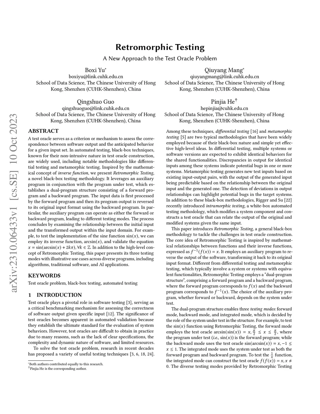 A test oracle serves as a criterion or mechanism to assess the correspondence between software output and the anticipated behavior for a given input set. In automated testing, black-box techniques, known for their non-intrusive nature in test oracle construction, are widely used, including notable methodologies like differential testing and metamorphic testing. Inspired by the mathematical concept of inverse function, we present Retromorphic Testing, a novel black-box testing methodology. It leverages an auxiliary program in conjunction with the program under test, which establishes a dual-program structure consisting of a forward program and a backward program. The input data is first processed by the forward program and then its program output is reversed to its original input format using the backward program. In particular, the auxiliary program can operate as either the forward or backward program, leading to different testing modes. The process concludes by examining the relationship between the initial input and the transformed output within the input domain. For example, to test the implementation of the sine function , we can employ its inverse function, , and validate the equation . In addition to the high-level concept of Retromorphic Testing, this paper presents its three testing modes with illustrative use cases across diverse programs, including algorithms, traditional software, and AI applications.