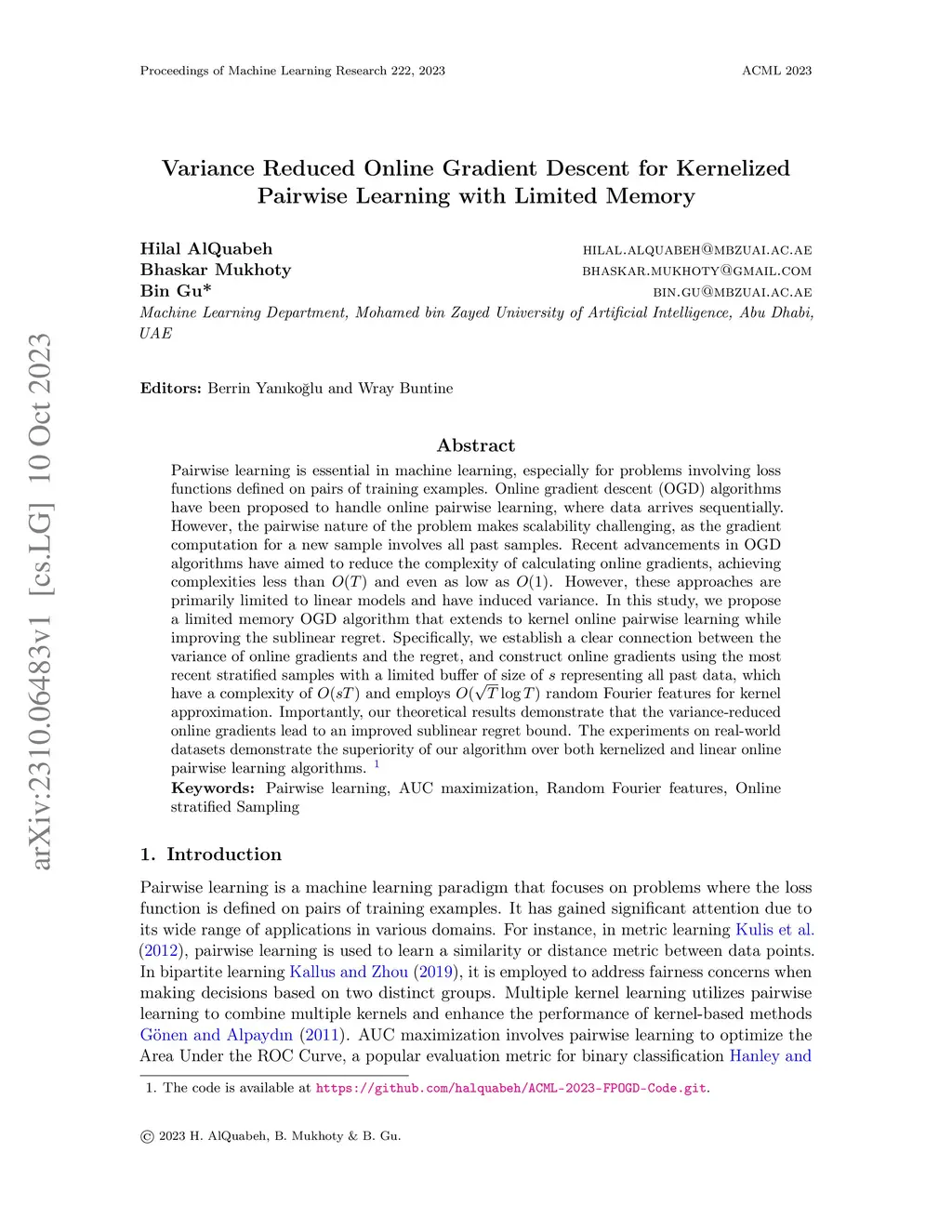 Pairwise learning is essential in machine learning, especially for problems involving loss functions defined on pairs of training examples. Online gradient descent (OGD) algorithms have been proposed to handle online pairwise learning, where data arrives sequentially. However, the pairwise nature of the problem makes scalability challenging, as the gradient computation for a new sample involves all past samples. Recent advancements in OGD algorithms have aimed to reduce the complexity of calculating online gradients, achieving complexities less than and even as low as . However, these approaches are primarily limited to linear models and have induced variance. In this study, we propose a limited memory OGD algorithm that extends to kernel online pairwise learning while improving the sublinear regret. Specifically, we establish a clear connection between the variance of online gradients and the regret, and construct online gradients using the most recent stratified samples with a limited buffer of size of representing all past data, which have a complexity of and employs random Fourier features for kernel approximation. Importantly, our theoretical results demonstrate that the variance-reduced online gradients lead to an improved sublinear regret bound. The experiments on real-world datasets demonstrate the superiority of our algorithm over both kernelized and linear online pairwise learning algorithms.