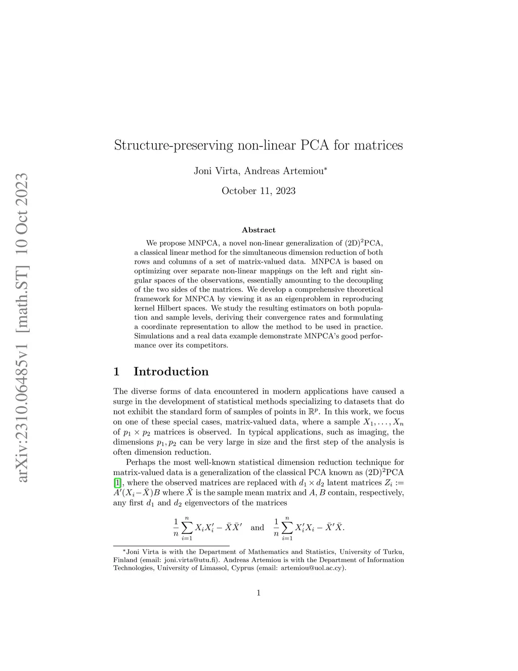 We propose MNPCA, a novel non-linear generalization of (2D){PCA}, a classical linear method for the simultaneous dimension reduction of both rows and columns of a set of matrix-valued data. MNPCA is based on optimizing over separate non-linear mappings on the left and right singular spaces of the observations, essentially amounting to the decoupling of the two sides of the matrices. We develop a comprehensive theoretical framework for MNPCA by viewing it as an eigenproblem in reproducing kernel Hilbert spaces. We study the resulting estimators on both population and sample levels, deriving their convergence rates and formulating a coordinate representation to allow the method to be used in practice. Simulations and a real data example demonstrate MNPCA's good performance over its competitors.