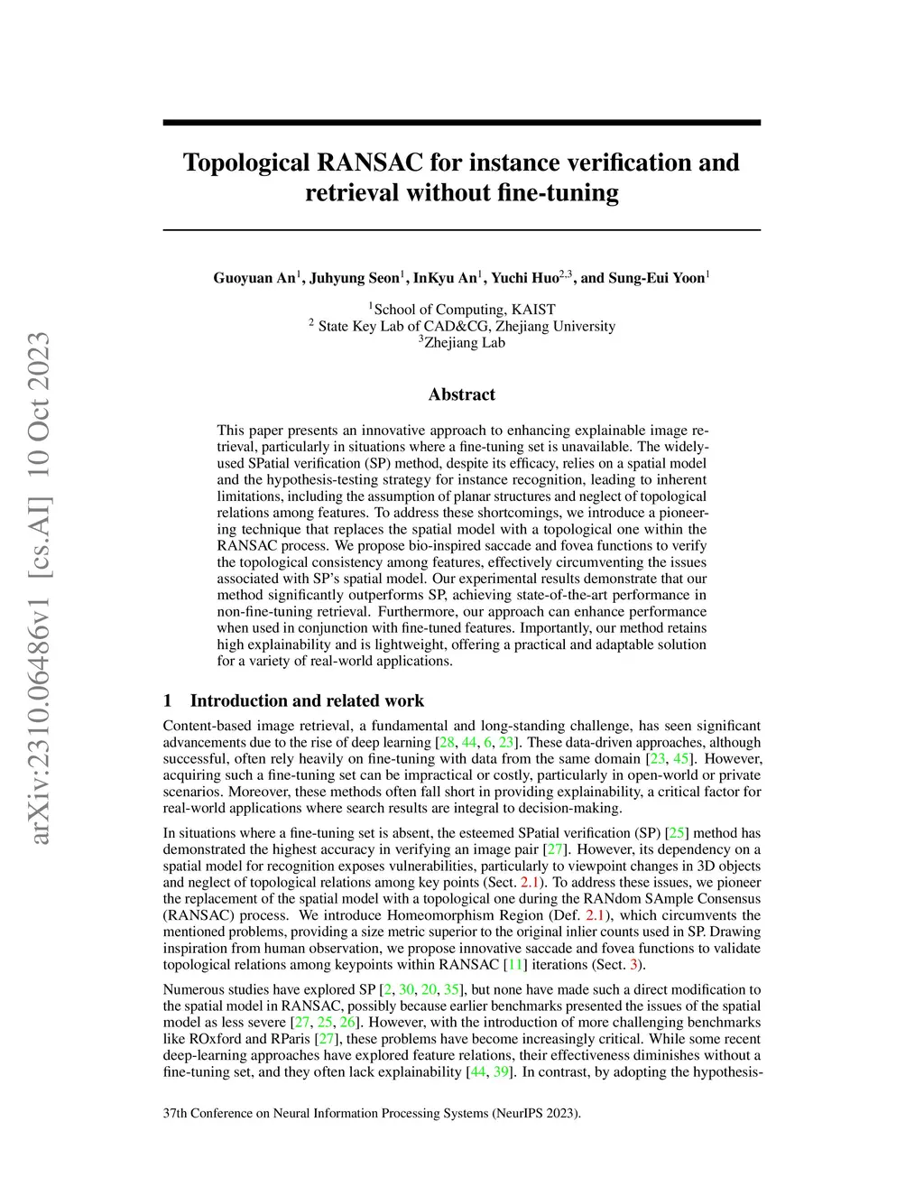 This paper presents an innovative approach to enhancing explainable image retrieval, particularly in situations where a fine-tuning set is unavailable. The widely-used SPatial verification (SP) method, despite its efficacy, relies on a spatial model and the hypothesis-testing strategy for instance recognition, leading to inherent limitations, including the assumption of planar structures and neglect of topological relations among features. To address these shortcomings, we introduce a pioneering technique that replaces the spatial model with a topological one within the RANSAC process. We propose bio-inspired saccade and fovea functions to verify the topological consistency among features, effectively circumventing the issues associated with SP's spatial model. Our experimental results demonstrate that our method significantly outperforms SP, achieving state-of-the-art performance in non-fine-tuning retrieval. Furthermore, our approach can enhance performance when used in conjunction with fine-tuned features. Importantly, our method retains high explainability and is lightweight, offering a practical and adaptable solution for a variety of real-world applications.