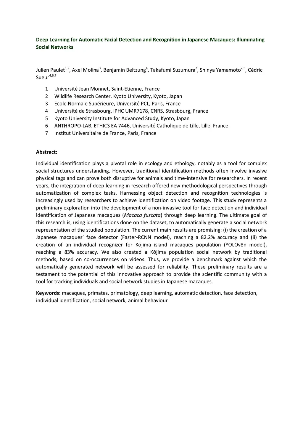 Individual identification plays a pivotal role in ecology and ethology, notably as a tool for complex social structures understanding. However, traditional identification methods often involve invasive physical tags and can prove both disruptive for animals and time-intensive for researchers. In recent years, the integration of deep learning in research offered new methodological perspectives through automatization of complex tasks. Harnessing object detection and recognition technologies is increasingly used by researchers to achieve identification on video footage. This study represents a preliminary exploration into the development of a non-invasive tool for face detection and individual identification of Japanese macaques (Macaca fuscata) through deep learning. The ultimate goal of this research is, using identifications done on the dataset, to automatically generate a social network representation of the studied population. The current main results are promising: (i) the creation of a Japanese macaques' face detector (Faster-RCNN model), reaching a 82.2% accuracy and (ii) the creation of an individual recognizer for K{\=o}jima island macaques population (YOLOv8n model), reaching a 83% accuracy. We also created a K{\=o}jima population social network by traditional methods, based on co-occurrences on videos. Thus, we provide a benchmark against which the automatically generated network will be assessed for reliability. These preliminary results are a testament to the potential of this innovative approach to provide the scientific community with a tool for tracking individuals and social network studies in Japanese macaques.