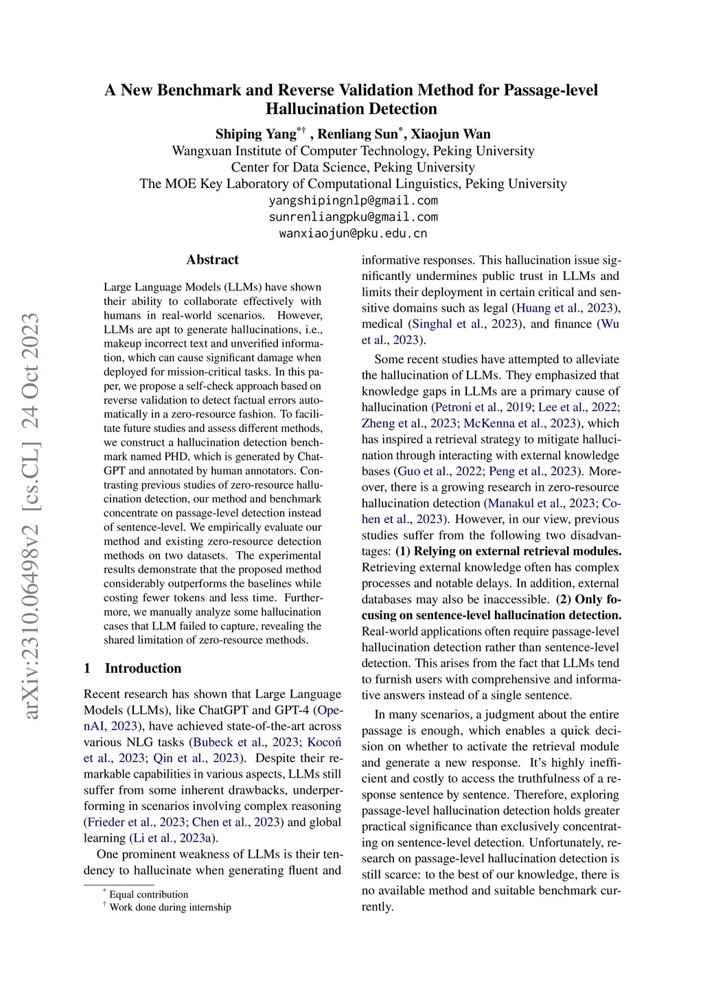 Large Language Models (LLMs) have shown their ability to collaborate effectively with humans in real-world scenarios. However, LLMs are apt to generate hallucinations, i.e., makeup incorrect text and unverified information, which can cause significant damage when deployed for mission-critical tasks. In this paper, we propose a self-check approach based on reverse validation to detect factual errors automatically in a zero-resource fashion. To facilitate future studies and assess different methods, we construct a hallucination detection benchmark named PHD, which is generated by ChatGPT and annotated by human annotators. Contrasting previous studies of zero-resource hallucination detection, our method and benchmark concentrate on passage-level detection instead of sentence-level. We empirically evaluate our method and existing zero-resource detection methods on two datasets. The experimental results demonstrate that the proposed method considerably outperforms the baselines while costing fewer tokens and less time. Furthermore, we manually analyze some hallucination cases that LLM failed to capture, revealing the shared limitation of zero-resource methods.