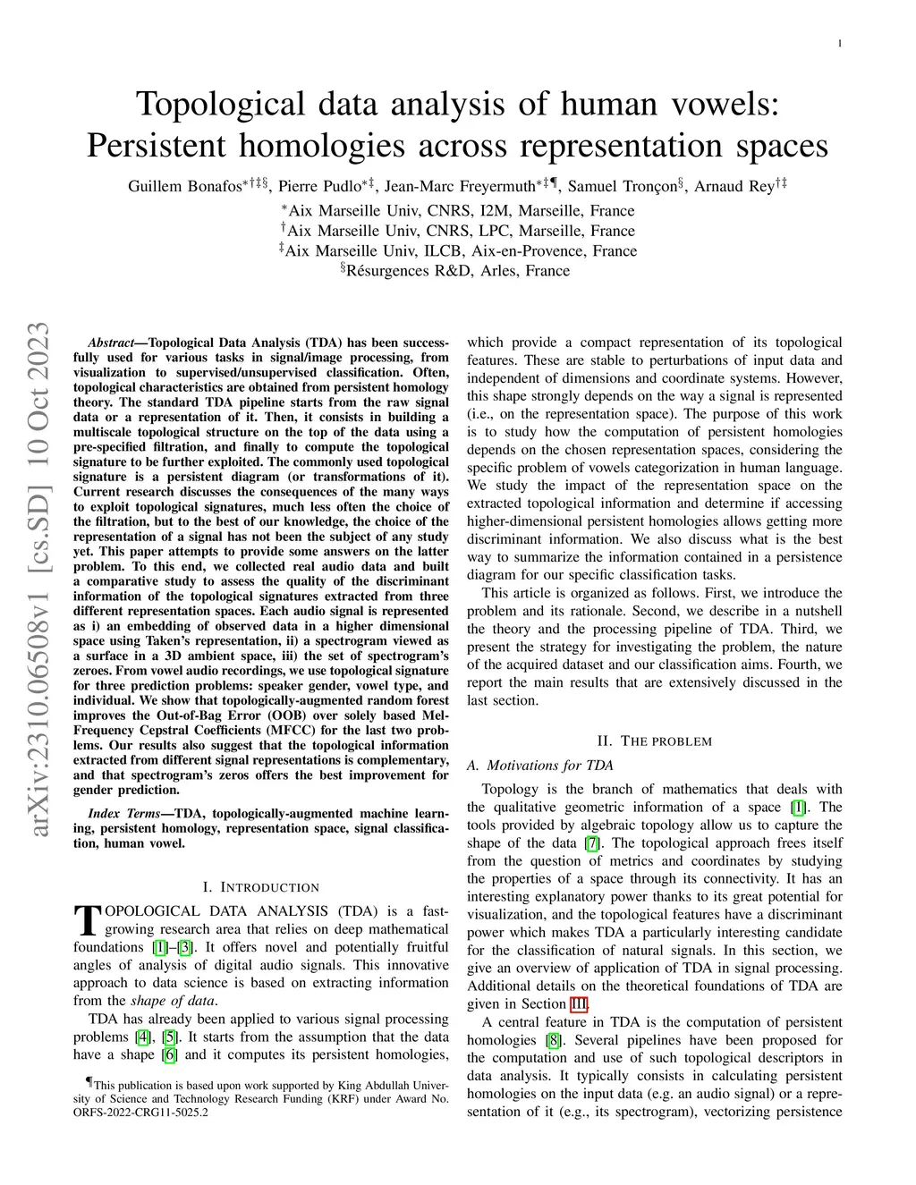 Topological Data Analysis (TDA) has been successfully used for various tasks in signal/image processing, from visualization to supervised/unsupervised classification. Often, topological characteristics are obtained from persistent homology theory. The standard TDA pipeline starts from the raw signal data or a representation of it. Then, it consists in building a multiscale topological structure on the top of the data using a pre-specified filtration, and finally to compute the topological signature to be further exploited. The commonly used topological signature is a persistent diagram (or transformations of it). Current research discusses the consequences of the many ways to exploit topological signatures, much less often the choice of the filtration, but to the best of our knowledge, the choice of the representation of a signal has not been the subject of any study yet. This paper attempts to provide some answers on the latter problem. To this end, we collected real audio data and built a comparative study to assess the quality of the discriminant information of the topological signatures extracted from three different representation spaces. Each audio signal is represented as i) an embedding of observed data in a higher dimensional space using Taken's representation, ii) a spectrogram viewed as a surface in a 3D ambient space, iii) the set of spectrogram's zeroes. From vowel audio recordings, we use topological signature for three prediction problems: speaker gender, vowel type, and individual. We show that topologically-augmented random forest improves the Out-of-Bag Error (OOB) over solely based Mel-Frequency Cepstral Coefficients (MFCC) for the last two problems. Our results also suggest that the topological information extracted from different signal representations is complementary, and that spectrogram's zeros offers the best improvement for gender prediction.