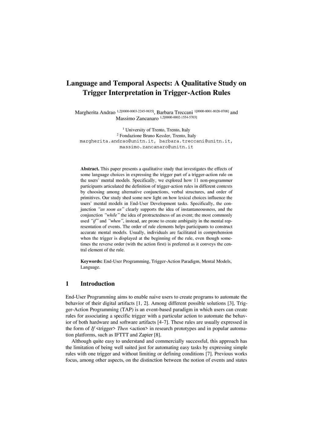This paper presents a qualitative study that investigates the effects of some language choices in expressing the trigger part of a trigger-action rule on the users' mental models. Specifically, we explored how 11 non-programmer participants articulated the definition of trigger-action rules in different contexts by choosing among alternative conjunctions, verbal structures, and order of primitives. Our study shed some new light on how lexical choices influence the users' mental models in End-User Development tasks. Specifically, the conjunction "as soon as" clearly supports the idea of instantaneousness, and the conjunction "while" the idea of protractedness of an event; the most commonly used "if" and "when", instead, are prone to create ambiguity in the mental representation of events. The order of rule elements helps participants to construct accurate mental models. Usually, individuals are facilitated in comprehension when the trigger is displayed at the beginning of the rule, even though sometimes the reverse order (with the action first) is preferred as it conveys the central element of the rule.