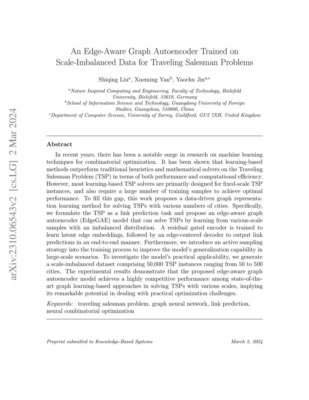 In recent years, there has been a notable surge in research on machine learning techniques for combinatorial optimization. It has been shown that learning-based methods outperform traditional heuristics and mathematical solvers on the Traveling Salesman Problem (TSP) in terms of both performance and computational efficiency. However, most learning-based TSP solvers are primarily designed for fixed-scale TSP instances, and also require a large number of training samples to achieve optimal performance. To fill this gap, this work proposes a data-driven graph representation learning method for solving TSPs with various numbers of cities. Specifically, we formulate the TSP as a link prediction task and propose an edge-aware graph autoencoder (EdgeGAE) model that can solve TSPs by learning from various-scale samples with an imbalanced distribution. A residual gated encoder is trained to learn latent edge embeddings, followed by an edge-centered decoder to output link predictions in an end-to-end manner. Furthermore, we introduce an active sampling strategy into the training process to improve the model's generalization capability in large-scale scenarios. To investigate the model's practical applicability, we generate a scale-imbalanced dataset comprising 50,000 TSP instances ranging from 50 to 500 cities. The experimental results demonstrate that the proposed edge-aware graph autoencoder model achieves a highly competitive performance among state-of-the-art graph learning-based approaches in solving TSPs with various scales, implying its remarkable potential in dealing with practical optimization challenges.