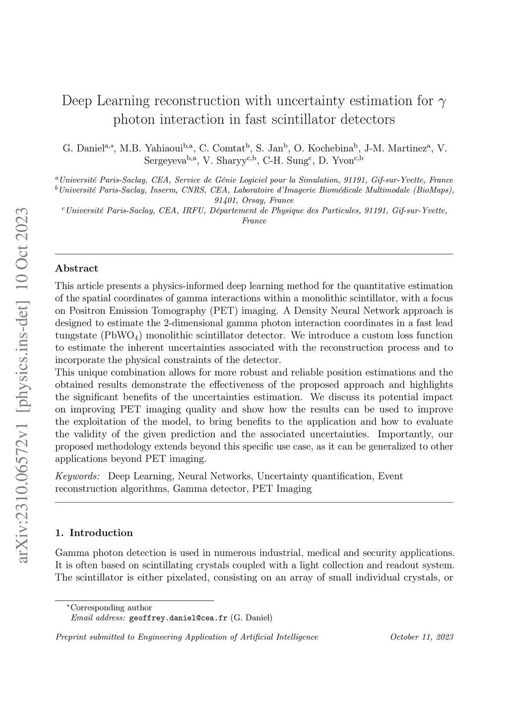 This article presents a physics-informed deep learning method for the quantitative estimation of the spatial coordinates of gamma interactions within a monolithic scintillator, with a focus on Positron Emission Tomography (PET) imaging. A Density Neural Network approach is designed to estimate the 2-dimensional gamma photon interaction coordinates in a fast lead tungstate (PbWO4) monolithic scintillator detector. We introduce a custom loss function to estimate the inherent uncertainties associated with the reconstruction process and to incorporate the physical constraints of the detector. This unique combination allows for more robust and reliable position estimations and the obtained results demonstrate the effectiveness of the proposed approach and highlights the significant benefits of the uncertainties estimation. We discuss its potential impact on improving PET imaging quality and show how the results can be used to improve the exploitation of the model, to bring benefits to the application and how to evaluate the validity of the given prediction and the associated uncertainties. Importantly, our proposed methodology extends beyond this specific use case, as it can be generalized to other applications beyond PET imaging.