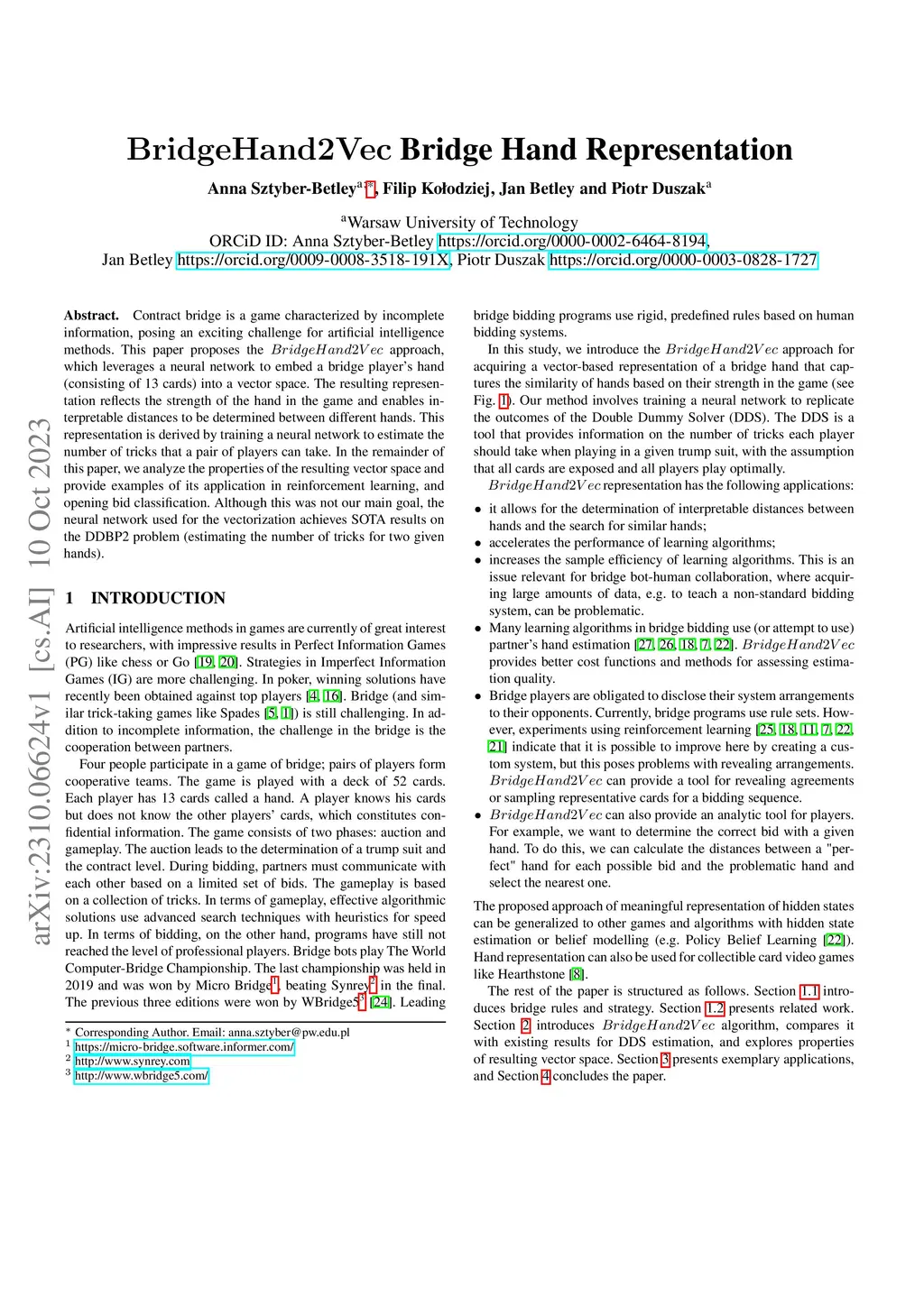 Contract bridge is a game characterized by incomplete information, posing an exciting challenge for artificial intelligence methods. This paper proposes the BridgeHand2Vec approach, which leverages a neural network to embed a bridge player's hand (consisting of 13 cards) into a vector space. The resulting representation reflects the strength of the hand in the game and enables interpretable distances to be determined between different hands. This representation is derived by training a neural network to estimate the number of tricks that a pair of players can take. In the remainder of this paper, we analyze the properties of the resulting vector space and provide examples of its application in reinforcement learning, and opening bid classification. Although this was not our main goal, the neural network used for the vectorization achieves SOTA results on the DDBP2 problem (estimating the number of tricks for two given hands).