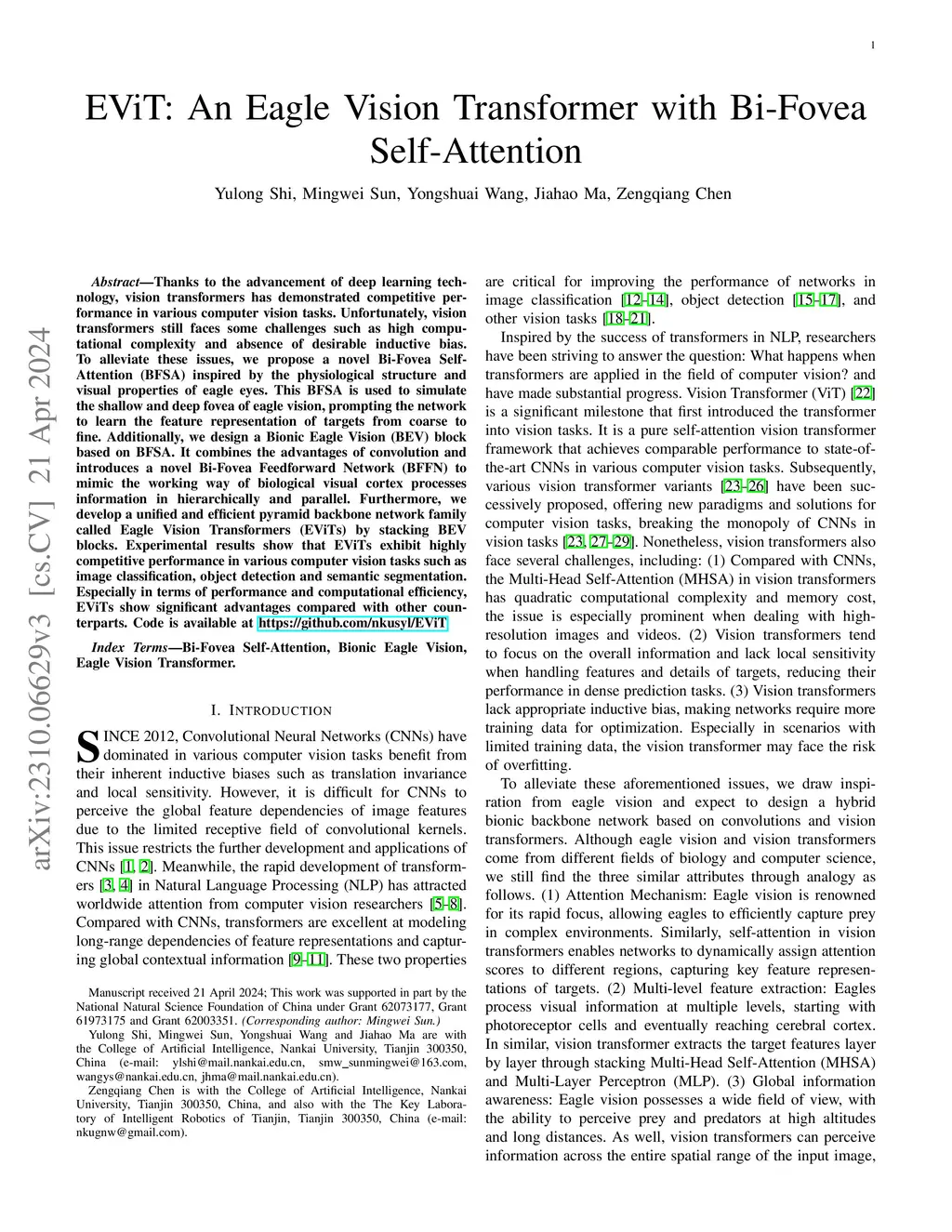 EViT: An Eagle Vision Transformer with Bi-Fovea Self-Attention