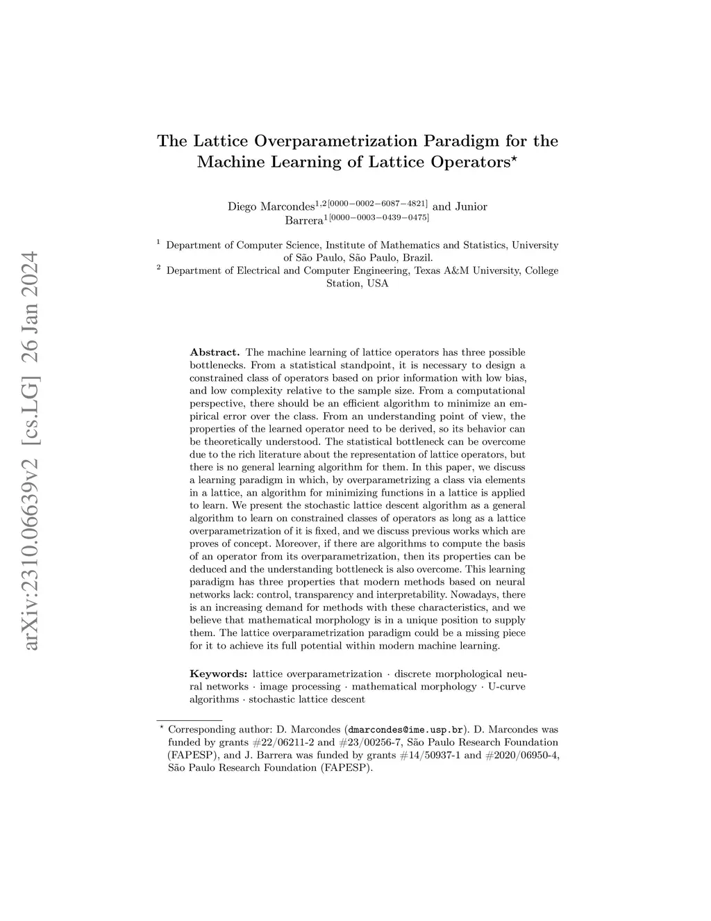 The machine learning of lattice operators has three possible bottlenecks. From a statistical standpoint, it is necessary to design a constrained class of operators based on prior information with low bias, and low complexity relative to the sample size. From a computational perspective, there should be an efficient algorithm to minimize an empirical error over the class. From an understanding point of view, the properties of the learned operator need to be derived, so its behavior can be theoretically understood. The statistical bottleneck can be overcome due to the rich literature about the representation of lattice operators, but there is no general learning algorithm for them. In this paper, we discuss a learning paradigm in which, by overparametrizing a class via elements in a lattice, an algorithm for minimizing functions in a lattice is applied to learn. We present the stochastic lattice descent algorithm as a general algorithm to learn on constrained classes of operators as long as a lattice overparametrization of it is fixed, and we discuss previous works which are proves of concept. Moreover, if there are algorithms to compute the basis of an operator from its overparametrization, then its properties can be deduced and the understanding bottleneck is also overcome. This learning paradigm has three properties that modern methods based on neural networks lack: control, transparency and interpretability. Nowadays, there is an increasing demand for methods with these characteristics, and we believe that mathematical morphology is in a unique position to supply them. The lattice overparametrization paradigm could be a missing piece for it to achieve its full potential within modern machine learning.