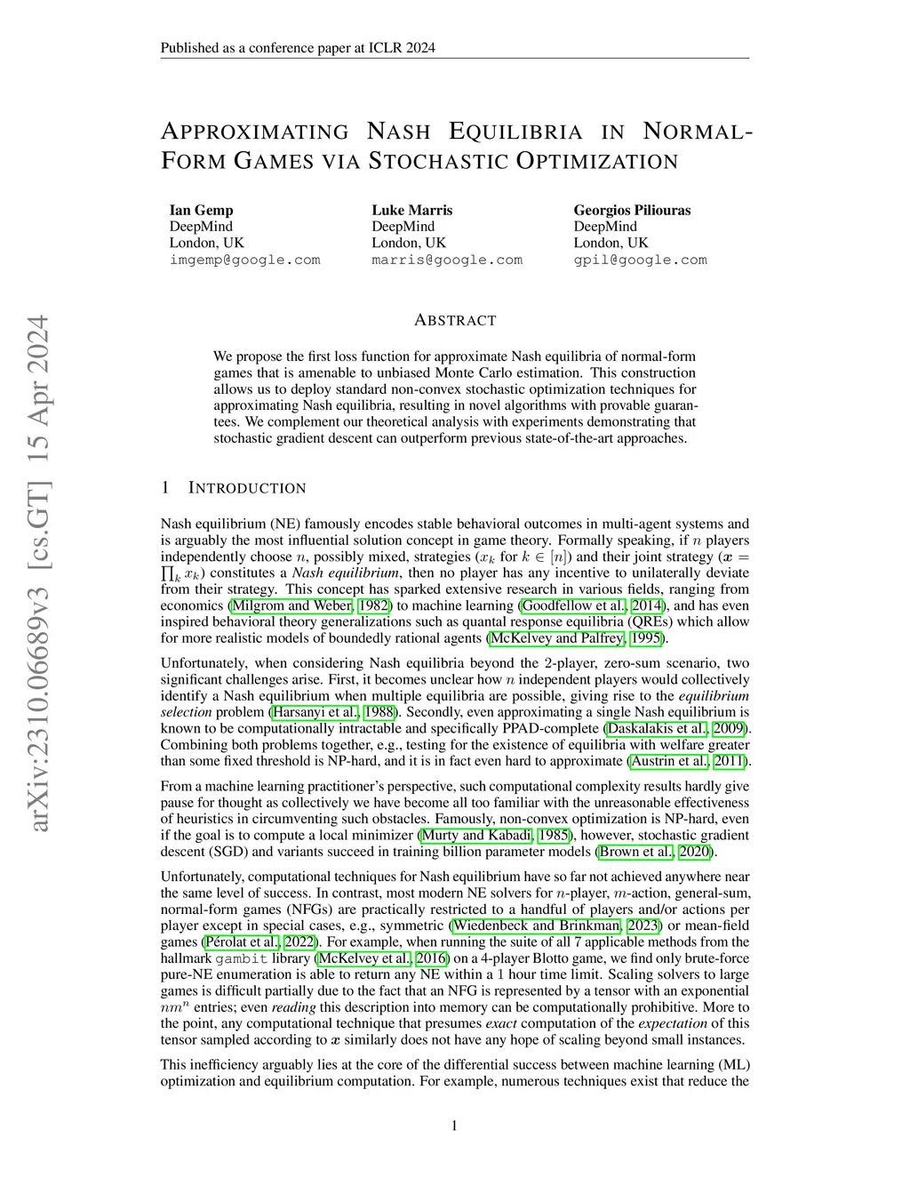 We propose the first loss function for approximate Nash equilibria of normal-form games that is amenable to unbiased Monte Carlo estimation. This construction allows us to deploy standard non-convex stochastic optimization techniques for approximating Nash equilibria, resulting in novel algorithms with provable guarantees. We complement our theoretical analysis with experiments demonstrating that stochastic gradient descent can outperform previous state-of-the-art approaches.