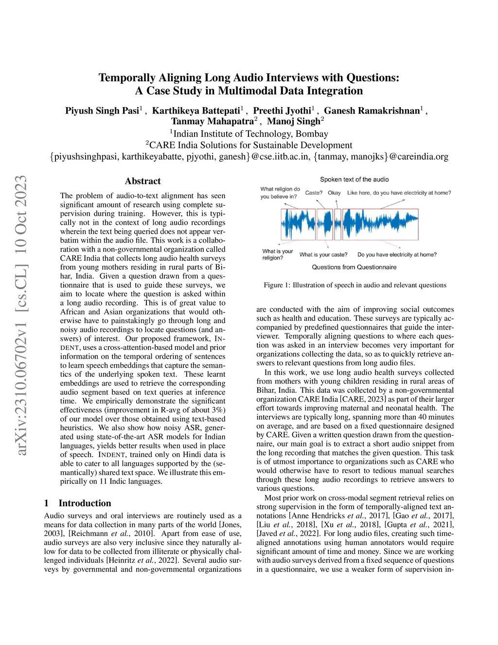 The problem of audio-to-text alignment has seen significant amount of research using complete supervision during training. However, this is typically not in the context of long audio recordings wherein the text being queried does not appear verbatim within the audio file. This work is a collaboration with a non-governmental organization called CARE India that collects long audio health surveys from young mothers residing in rural parts of Bihar, India. Given a question drawn from a questionnaire that is used to guide these surveys, we aim to locate where the question is asked within a long audio recording. This is of great value to African and Asian organizations that would otherwise have to painstakingly go through long and noisy audio recordings to locate questions (and answers) of interest. Our proposed framework, INDENT, uses a cross-attention-based model and prior information on the temporal ordering of sentences to learn speech embeddings that capture the semantics of the underlying spoken text. These learnt embeddings are used to retrieve the corresponding audio segment based on text queries at inference time. We empirically demonstrate the significant effectiveness (improvement in R-avg of about 3%) of our model over those obtained using text-based heuristics. We also show how noisy ASR, generated using state-of-the-art ASR models for Indian languages, yields better results when used in place of speech. INDENT, trained only on Hindi data is able to cater to all languages supported by the (semantically) shared text space. We illustrate this empirically on 11 Indic languages.