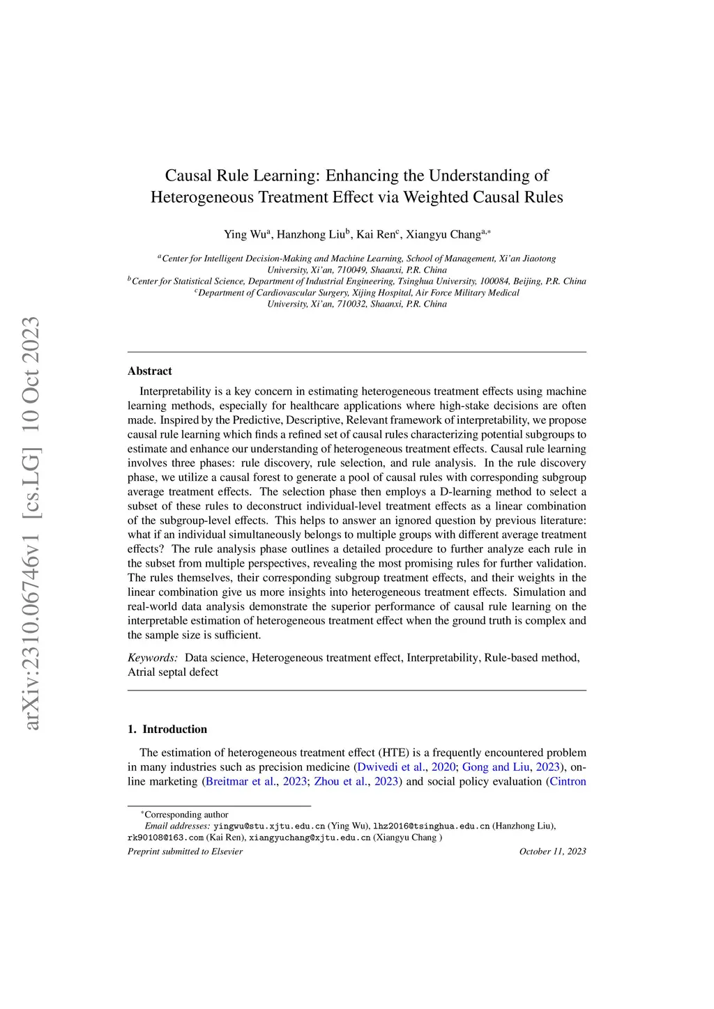 Interpretability plays a crucial role in the application of statistical learning to estimate heterogeneous treatment effects (HTE) in complex diseases. In this study, we leverage a rule-based workflow, namely causal rule learning (CRL), to estimate and improve our understanding of HTE for atrial septal defect, addressing an overlooked question in the previous literature: what if an individual simultaneously belongs to multiple groups with different average treatment effects? The CRL process consists of three steps: rule discovery, which generates a set of causal rules with corresponding subgroup average treatment effects; rule selection, which identifies a subset of these rules to deconstruct individual-level treatment effects as a linear combination of subgroup-level effects; and rule analysis, which presents a detailed procedure for further analyzing each selected rule from multiple perspectives to identify the most promising rules for validation. Extensive simulation studies and real-world data analysis demonstrate that CRL outperforms other methods in providing interpretable estimates of HTE, especially when dealing with complex ground truth and sufficient sample sizes.