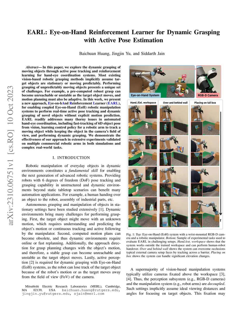 EARL: Eye-on-Hand Reinforcement Learner for Dynamic Grasping with Active