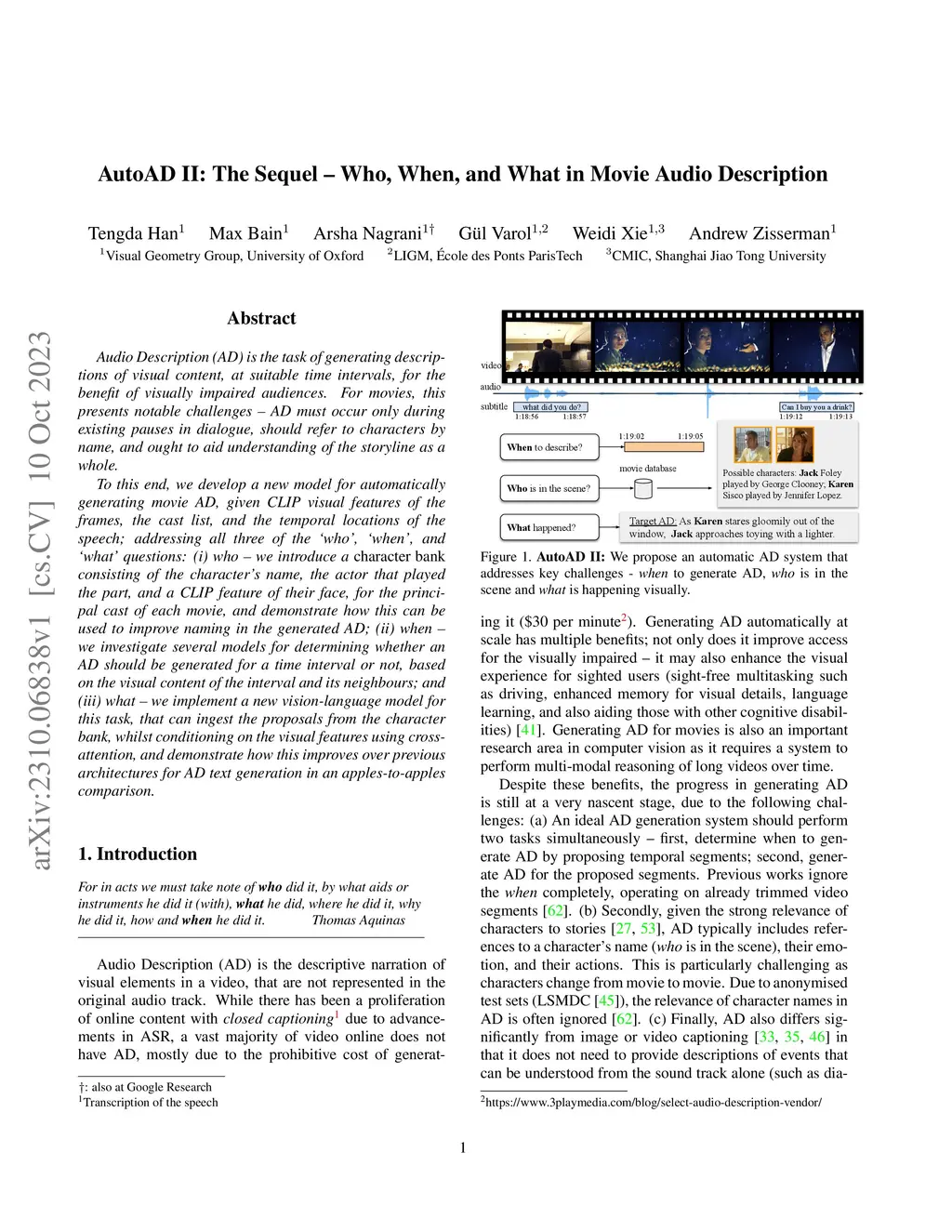 Audio Description (AD) is the task of generating descriptions of visual content, at suitable time intervals, for the benefit of visually impaired audiences. For movies, this presents notable challenges -- AD must occur only during existing pauses in dialogue, should refer to characters by name, and ought to aid understanding of the storyline as a whole. To this end, we develop a new model for automatically generating movie AD, given CLIP visual features of the frames, the cast list, and the temporal locations of the speech; addressing all three of the 'who', 'when', and 'what' questions: (i) who -- we introduce a character bank consisting of the character's name, the actor that played the part, and a CLIP feature of their face, for the principal cast of each movie, and demonstrate how this can be used to improve naming in the generated AD; (ii) when -- we investigate several models for determining whether an AD should be generated for a time interval or not, based on the visual content of the interval and its neighbours; and (iii) what -- we implement a new vision-language model for this task, that can ingest the proposals from the character bank, whilst conditioning on the visual features using cross-attention, and demonstrate how this improves over previous architectures for AD text generation in an apples-to-apples comparison.