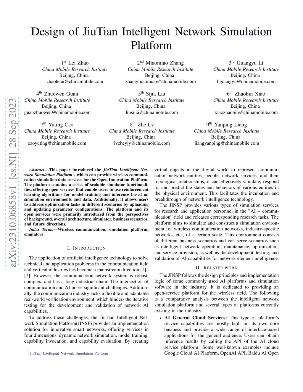 This paper introduced the JiuTian Intelligent Network Simulation Platform, which can provide wireless communication simulation data services for the Open Innovation Platform. The platform contains a series of scalable simulator functionalities, offering open services that enable users to use reinforcement learning algorithms for model training and inference based on simulation environments and data. Additionally, it allows users to address optimization tasks in different scenarios by uploading and updating parameter configurations. The platform and its open services were primarily introduced from the perspectives of background, overall architecture, simulator, business scenarios, and future directions.