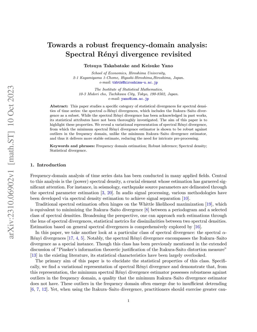 This paper studies a specific category of statistical divergences for spectral densities of time series: the spectral -R\'{e}nyi divergences, which includes the Itakura-Saito divergence as a subset. While the spectral R\'{e}nyi divergence has been acknowledged in past works, its statistical attributes have not been thoroughly investigated. The aim of this paper is to highlight these properties. We reveal a variational representation of spectral R\'{e}nyi divergence, from which the minimum spectral R\'{e}nyi divergence estimator is shown to be robust against outliers in the frequency domain, unlike the minimum Itakura-Saito divergence estimator, and thus it delivers more stable estimate, reducing the need for intricate pre-processing.