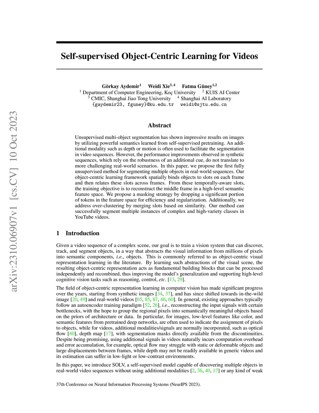 Self-supervised Object-Centric Learning for Videos