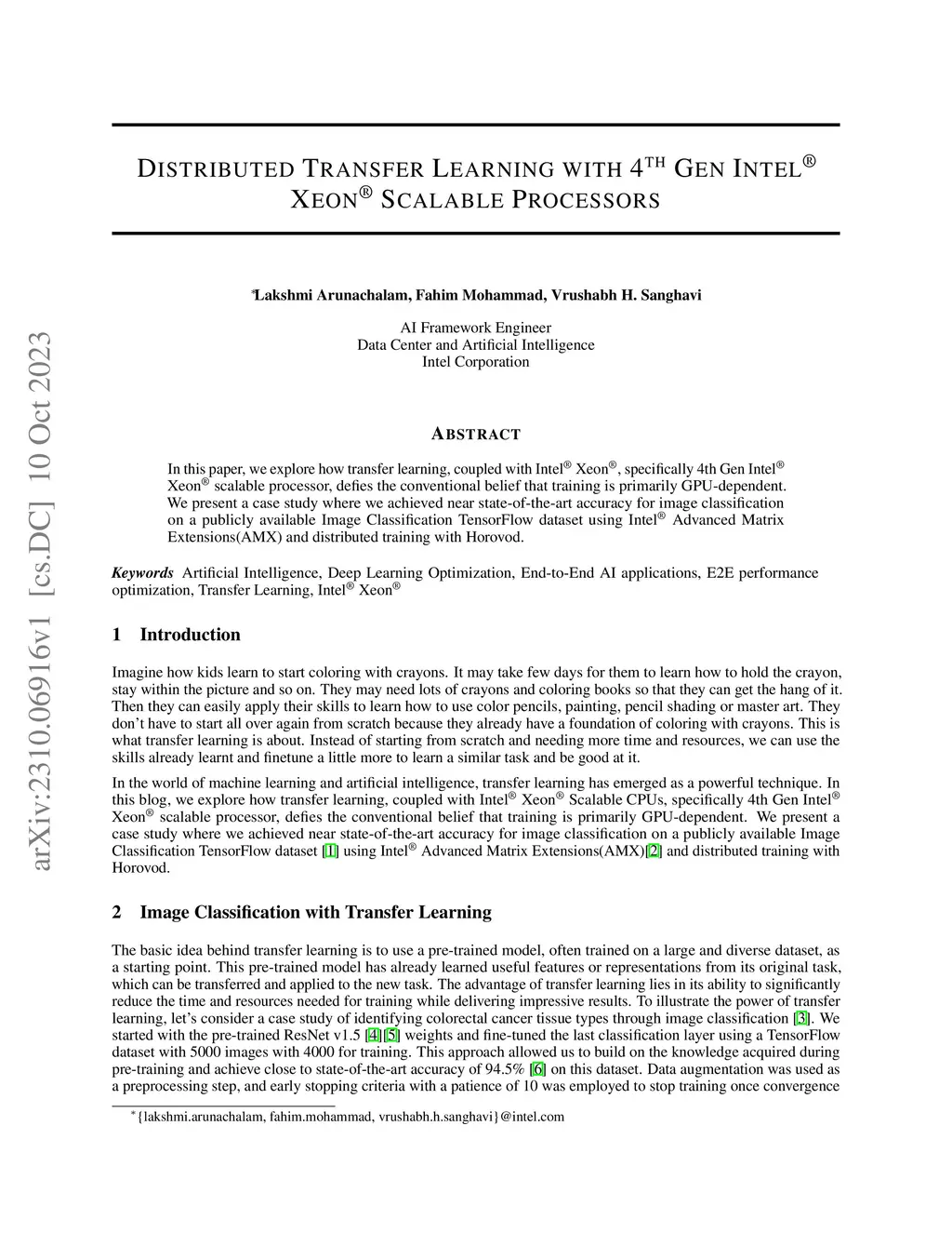 In this paper, we explore how transfer learning, coupled with Intel Xeon, specifically 4th Gen Intel Xeon scalable processor, defies the conventional belief that training is primarily GPU-dependent. We present a case study where we achieved near state-of-the-art accuracy for image classification on a publicly available Image Classification TensorFlow dataset using Intel Advanced Matrix Extensions(AMX) and distributed training with Horovod.
