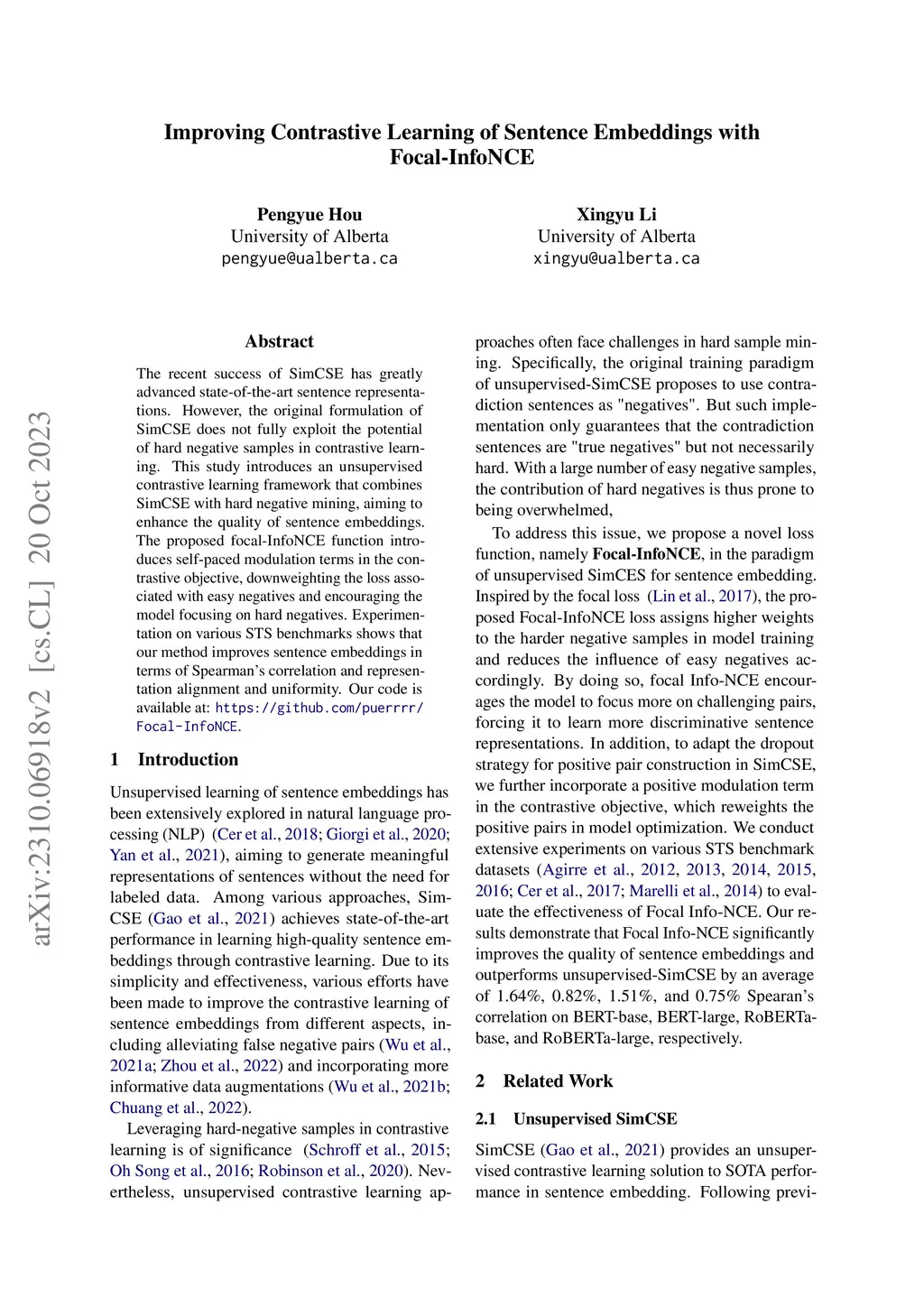 The recent success of SimCSE has greatly advanced state-of-the-art sentence representations. However, the original formulation of SimCSE does not fully exploit the potential of hard negative samples in contrastive learning. This study introduces an unsupervised contrastive learning framework that combines SimCSE with hard negative mining, aiming to enhance the quality of sentence embeddings. The proposed focal-InfoNCE function introduces self-paced modulation terms in the contrastive objective, downweighting the loss associated with easy negatives and encouraging the model focusing on hard negatives. Experimentation on various STS benchmarks shows that our method improves sentence embeddings in terms of Spearman's correlation and representation alignment and uniformity.