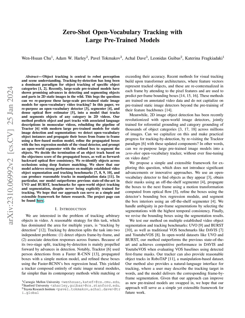 Object tracking is central to robot perception and scene understanding. Tracking-by-detection has long been a dominant paradigm for object tracking of specific object categories. Recently, large-scale pre-trained models have shown promising advances in detecting and segmenting objects and parts in 2D static images in the wild. This begs the question: can we re-purpose these large-scale pre-trained static image models for open-vocabulary video tracking? In this paper, we re-purpose an open-vocabulary detector, segmenter, and dense optical flow estimator, into a model that tracks and segments objects of any category in 2D videos. Our method predicts object and part tracks with associated language descriptions in monocular videos, rebuilding the pipeline of Tractor with modern large pre-trained models for static image detection and segmentation: we detect open-vocabulary object instances and propagate their boxes from frame to frame using a flow-based motion model, refine the propagated boxes with the box regression module of the visual detector, and prompt an open-world segmenter with the refined box to segment the objects. We decide the termination of an object track based on the objectness score of the propagated boxes, as well as forward-backward optical flow consistency. We re-identify objects across occlusions using deep feature matching. We show that our model achieves strong performance on multiple established video object segmentation and tracking benchmarks, and can produce reasonable tracks in manipulation data. In particular, our model outperforms previous state-of-the-art in UVO and BURST, benchmarks for open-world object tracking and segmentation, despite never being explicitly trained for tracking. We hope that our approach can serve as a simple and extensible framework for future research.