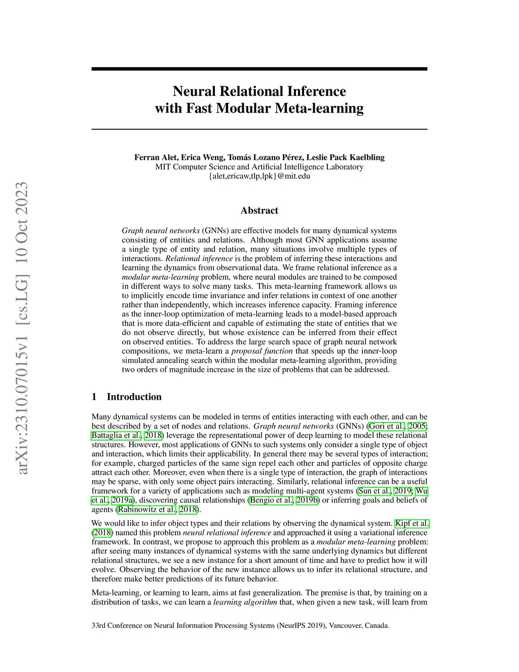 \textit{Graph neural networks} (GNNs) are effective models for many dynamical systems consisting of entities and relations. Although most GNN applications assume a single type of entity and relation, many situations involve multiple types of interactions. \textit{Relational inference} is the problem of inferring these interactions and learning the dynamics from observational data. We frame relational inference as a \textit{modular meta-learning} problem, where neural modules are trained to be composed in different ways to solve many tasks. This meta-learning framework allows us to implicitly encode time invariance and infer relations in context of one another rather than independently, which increases inference capacity. Framing inference as the inner-loop optimization of meta-learning leads to a model-based approach that is more data-efficient and capable of estimating the state of entities that we do not observe directly, but whose existence can be inferred from their effect on observed entities. To address the large search space of graph neural network compositions, we meta-learn a \textit{proposal function} that speeds up the inner-loop simulated annealing search within the modular meta-learning algorithm, providing two orders of magnitude increase in the size of problems that can be addressed.