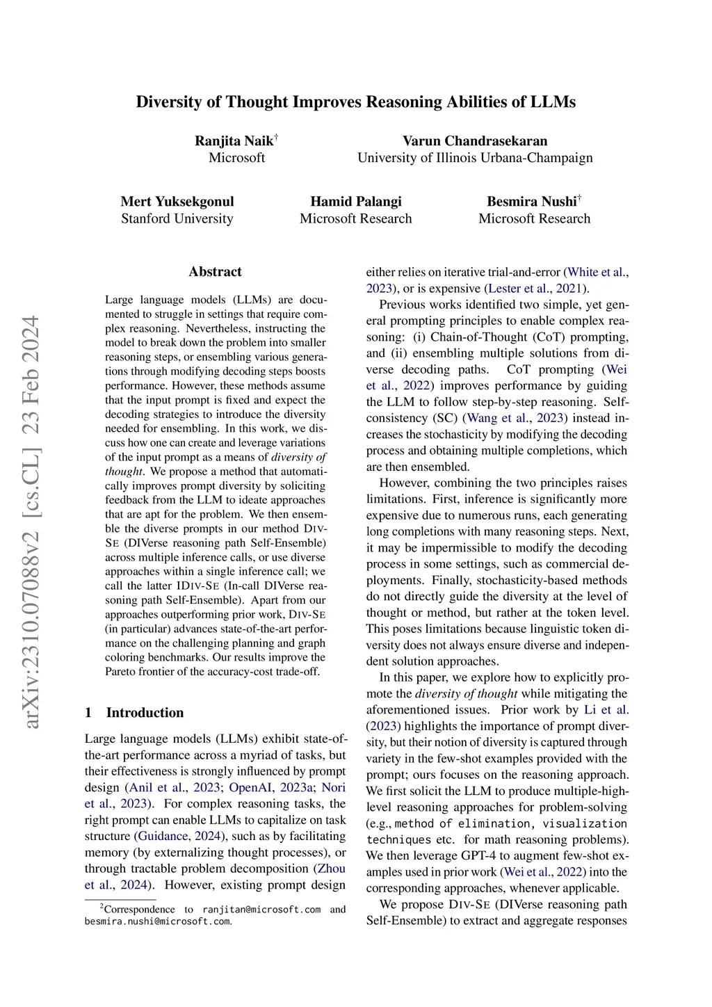 Large language models (LLMs) are documented to struggle in settings that require complex reasoning. Nevertheless, instructing the model to break down the problem into smaller reasoning steps, or ensembling various generations through modifying decoding steps boosts performance. However, these methods assume that the input prompt is fixed and expect the decoding strategies to introduce the diversity needed for ensembling. In this work, we discuss how one can create and leverage variations of the input prompt as a means of diversity of thought. We propose a method that automatically improves prompt diversity by soliciting feedback from the LLM to ideate approaches that are apt for the problem. We then ensemble the diverse prompts in our method DIVSE (DIVerse reasoning path Self-Ensemble) across multiple inference calls, or use diverse approaches within a single inference call; we call the latter IDIV-SE (In-call DIVerse reasoning path Self-Ensemble). Apart from our approaches outperforming prior work, DIV-SE(in particular) advances state-of-the-art performance on the challenging planning and graph coloring benchmarks. Our results improve the Pareto frontier of the accuracy-cost trade-off.