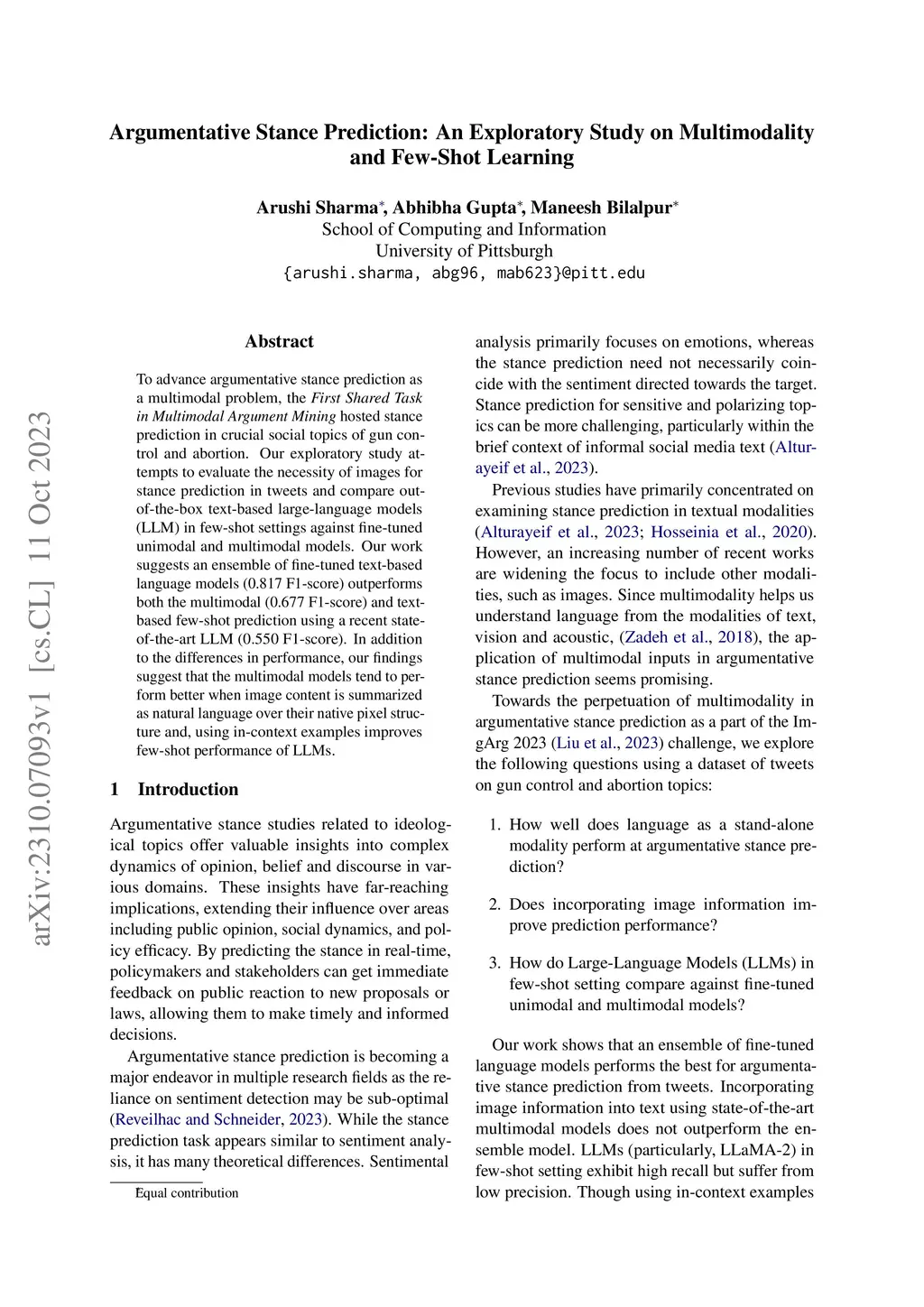 To advance argumentative stance prediction as a multimodal problem, the First Shared Task in Multimodal Argument Mining hosted stance prediction in crucial social topics of gun control and abortion. Our exploratory study attempts to evaluate the necessity of images for stance prediction in tweets and compare out-of-the-box text-based large-language models (LLM) in few-shot settings against fine-tuned unimodal and multimodal models. Our work suggests an ensemble of fine-tuned text-based language models (0.817 F1-score) outperforms both the multimodal (0.677 F1-score) and text-based few-shot prediction using a recent state-of-the-art LLM (0.550 F1-score). In addition to the differences in performance, our findings suggest that the multimodal models tend to perform better when image content is summarized as natural language over their native pixel structure and, using in-context examples improves few-shot performance of LLMs.