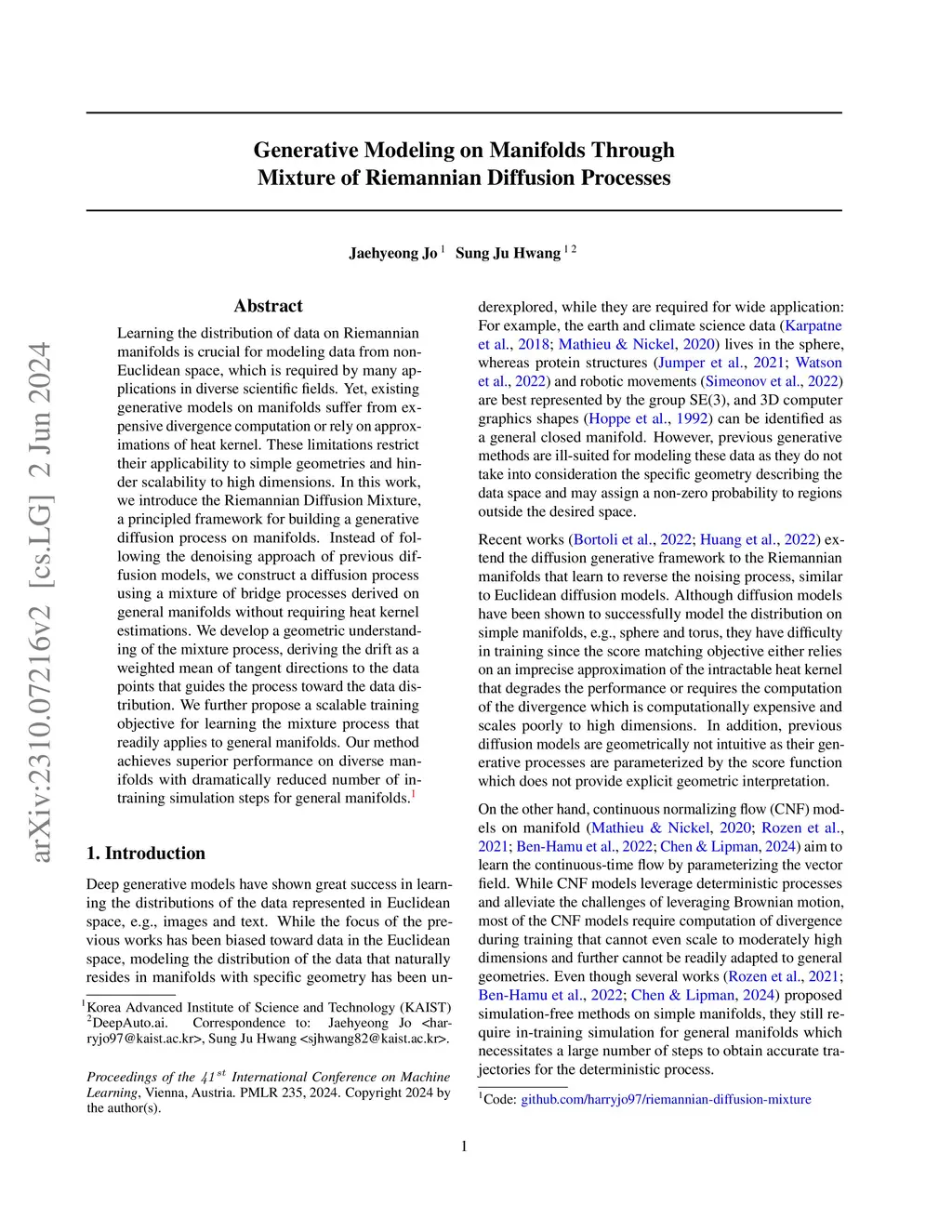 Learning the distribution of data on Riemannian manifolds is crucial for modeling data from non-Euclidean space, which is required by many applications in diverse scientific fields. Yet, existing generative models on manifolds suffer from expensive divergence computation or rely on approximations of heat kernel. These limitations restrict their applicability to simple geometries and hinder scalability to high dimensions. In this work, we introduce the Riemannian Diffusion Mixture, a principled framework for building a generative diffusion process on manifolds. Instead of following the denoising approach of previous diffusion models, we construct a diffusion process using a mixture of bridge processes derived on general manifolds without requiring heat kernel estimations. We develop a geometric understanding of the mixture process, deriving the drift as a weighted mean of tangent directions to the data points that guides the process toward the data distribution. We further propose a scalable training objective for learning the mixture process that readily applies to general manifolds. Our method achieves superior performance on diverse manifolds with dramatically reduced number of in-training simulation steps for general manifolds.