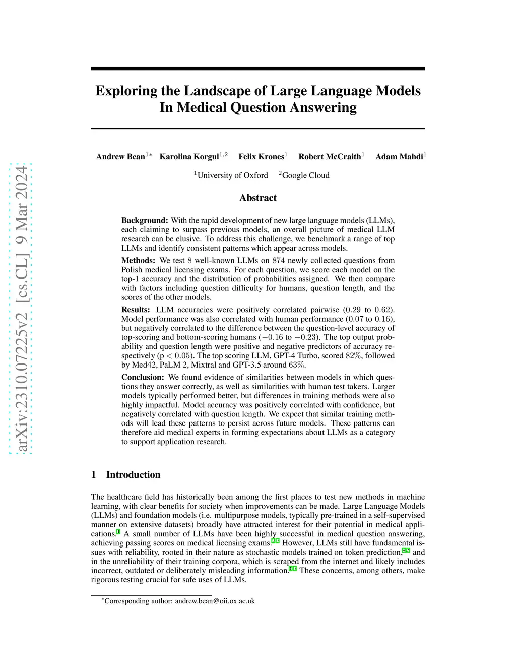 With the rapid development of new large language models (LLMs), each claiming to surpass previous models, an overall picture of medical LLM research can be elusive. To address this challenge, we benchmark a range of top LLMs and identify consistent patterns which appear across models. We test well-known LLMs on newly collected questions from Polish medical licensing exams. For each question, we score each model on the top-1 accuracy and the distribution of probabilities assigned. We then compare with factors including question difficulty for humans, question length, and the scores of the other models. LLM accuracies were positively correlated pairwise ( to ). Model performance was also correlated with human performance ( to ), but negatively correlated to the difference between the question-level accuracy of top-scoring and bottom-scoring humans ( to ). The top output probability and question length were positive and negative predictors of accuracy respectively (p ). The top scoring LLM, GPT-4 Turbo, scored , followed by Med42, PaLM 2, Mixtral and GPT-3.5 around . We found evidence of similarities between models in which questions they answer correctly, as well as similarities with human test takers. Larger models typically performed better, but differences in training methods were also highly impactful. Model accuracy was positively correlated with confidence, but negatively correlated with question length. We expect that similar training methods will lead these patterns to persist across future models. These patterns can therefore aid medical experts in forming expectations about LLMs as a category to support application research.