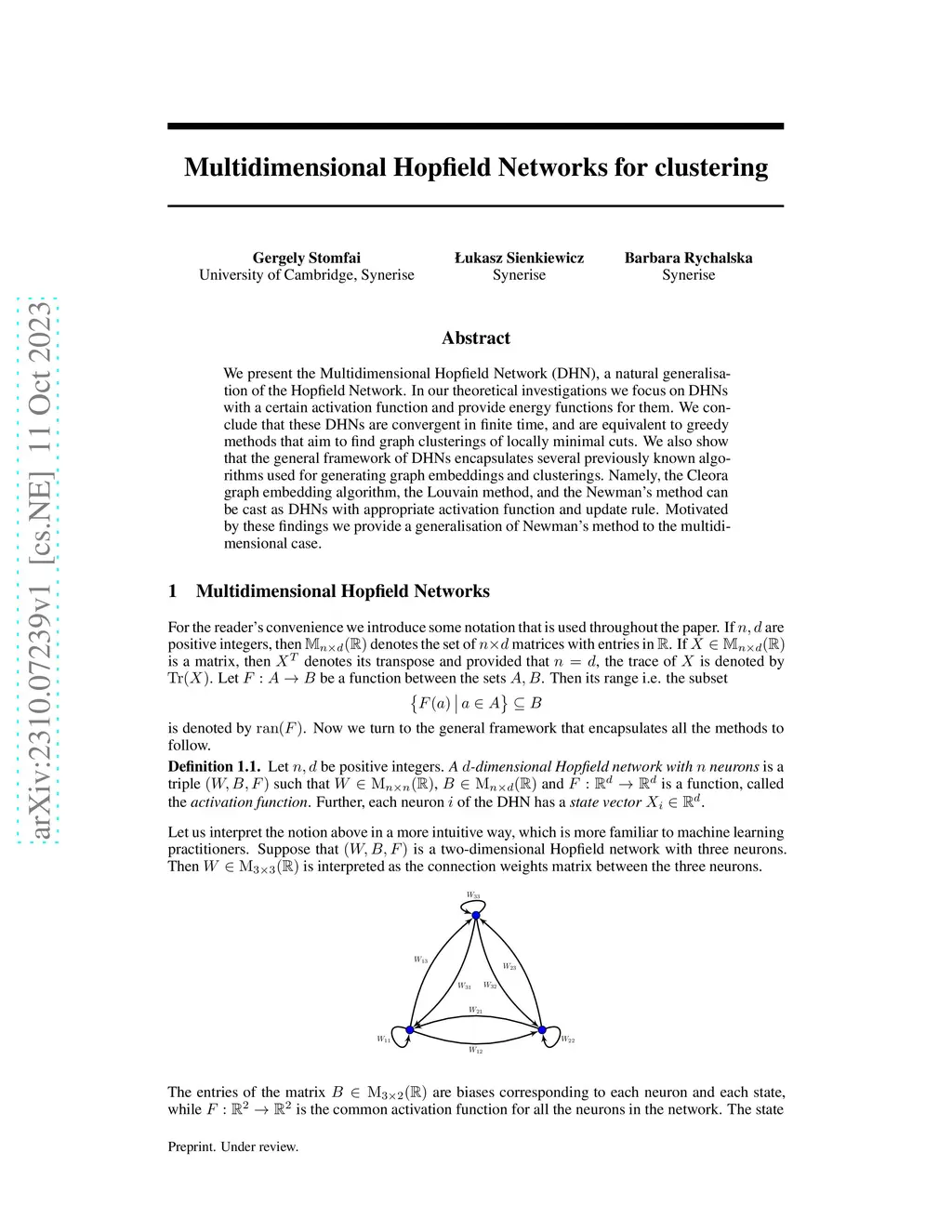 We present the Multidimensional Hopfield Network (DHN), a natural generalisation of the Hopfield Network. In our theoretical investigations we focus on DHNs with a certain activation function and provide energy functions for them. We conclude that these DHNs are convergent in finite time, and are equivalent to greedy methods that aim to find graph clusterings of locally minimal cuts. We also show that the general framework of DHNs encapsulates several previously known algorithms used for generating graph embeddings and clusterings. Namely, the Cleora graph embedding algorithm, the Louvain method, and the Newmans method can be cast as DHNs with appropriate activation function and update rule. Motivated by these findings we provide a generalisation of Newmans method to the multidimensional case.