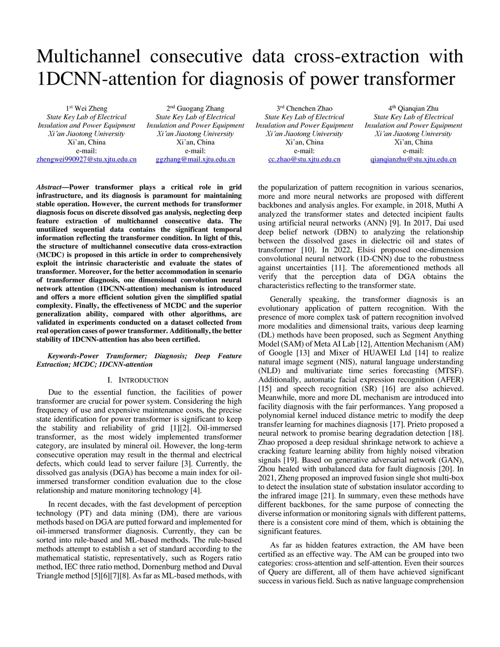 Power transformer plays a critical role in grid infrastructure, and its diagnosis is paramount for maintaining stable operation. However, the current methods for transformer diagnosis focus on discrete dissolved gas analysis, neglecting deep feature extraction of multichannel consecutive data. The unutilized sequential data contains the significant temporal information reflecting the transformer condition. In light of this, the structure of multichannel consecutive data cross-extraction (MCDC) is proposed in this article in order to comprehensively exploit the intrinsic characteristic and evaluate the states of transformer. Moreover, for the better accommodation in scenario of transformer diagnosis, one dimensional convolution neural network attention (1DCNN-attention) mechanism is introduced and offers a more efficient solution given the simplified spatial complexity. Finally, the effectiveness of MCDC and the superior generalization ability, compared with other algorithms, are validated in experiments conducted on a dataset collected from real operation cases of power transformer. Additionally, the better stability of 1DCNN-attention has also been certified.