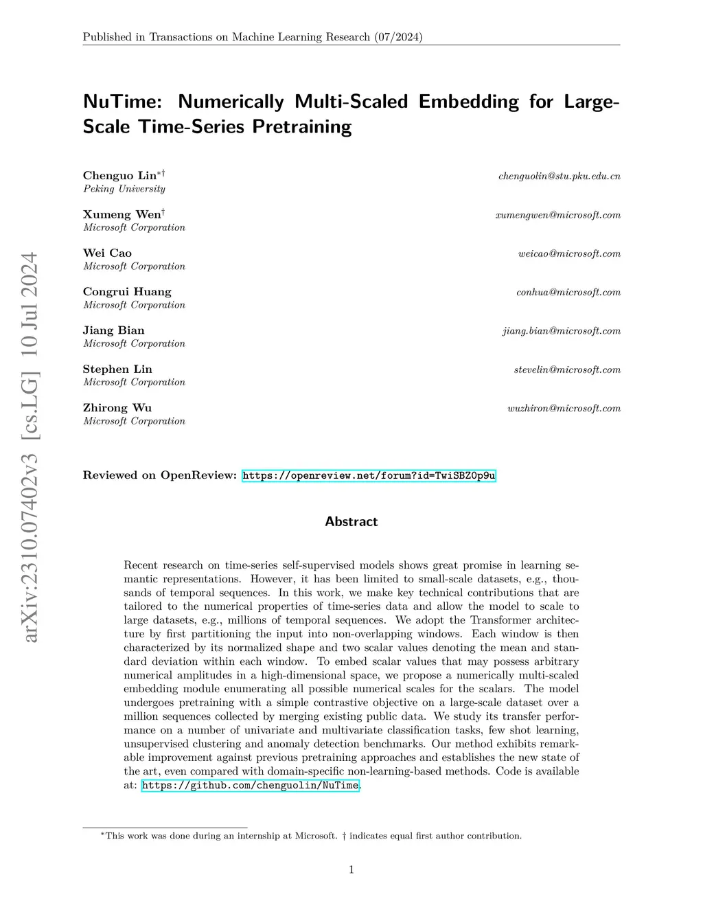 Recent research on time-series self-supervised models shows great promise in learning semantic representations. However, it has been limited to small-scale datasets, e.g., thousands of temporal sequences. In this work, we make key technical contributions that are tailored to the numerical properties of time-series data and allow the model to scale to large datasets, e.g., millions of temporal sequences. We adopt the Transformer architecture by first partitioning the input into non-overlapping windows. Each window is then characterized by its normalized shape and two scalar values denoting the mean and standard deviation within each window. To embed scalar values that may possess arbitrary numerical amplitudes in a high-dimensional space, we propose a numerically multi-scaled embedding module enumerating all possible numerical scales for the scalars. The model undergoes pretraining with a simple contrastive objective on a large-scale dataset over a million sequences collected by merging existing public data. We study its transfer performance on a number of univariate and multivariate classification tasks, few shot learning, unsupervised clustering and anomaly detection benchmarks. Our method exhibits remarkable improvement against previous pretraining approaches and establishes the new state of the art, even compared with domain-specific non-learning-based methods. Code is available at: \url{https://github.com/chenguolin/NuTime}.