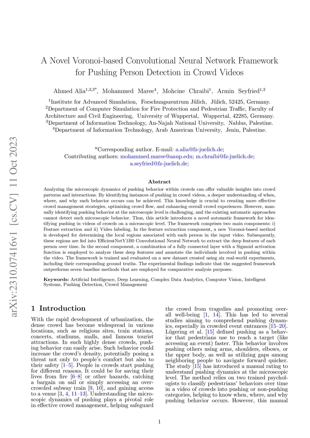 Analyzing the microscopic dynamics of pushing behavior within crowds can offer valuable insights into crowd patterns and interactions. By identifying instances of pushing in crowd videos, a deeper understanding of when, where, and why such behavior occurs can be achieved. This knowledge is crucial to creating more effective crowd management strategies, optimizing crowd flow, and enhancing overall crowd experiences. However, manually identifying pushing behavior at the microscopic level is challenging, and the existing automatic approaches cannot detect such microscopic behavior. Thus, this article introduces a novel automatic framework for identifying pushing in videos of crowds on a microscopic level. The framework comprises two main components: i) Feature extraction and ii) Video labeling. In the feature extraction component, a new Voronoi-based method is developed for determining the local regions associated with each person in the input video. Subsequently, these regions are fed into EfficientNetV1B0 Convolutional Neural Network to extract the deep features of each person over time. In the second component, a combination of a fully connected layer with a Sigmoid activation function is employed to analyze these deep features and annotate the individuals involved in pushing within the video. The framework is trained and evaluated on a new dataset created using six real-world experiments, including their corresponding ground truths. The experimental findings indicate that the suggested framework outperforms seven baseline methods that are employed for comparative analysis purposes.