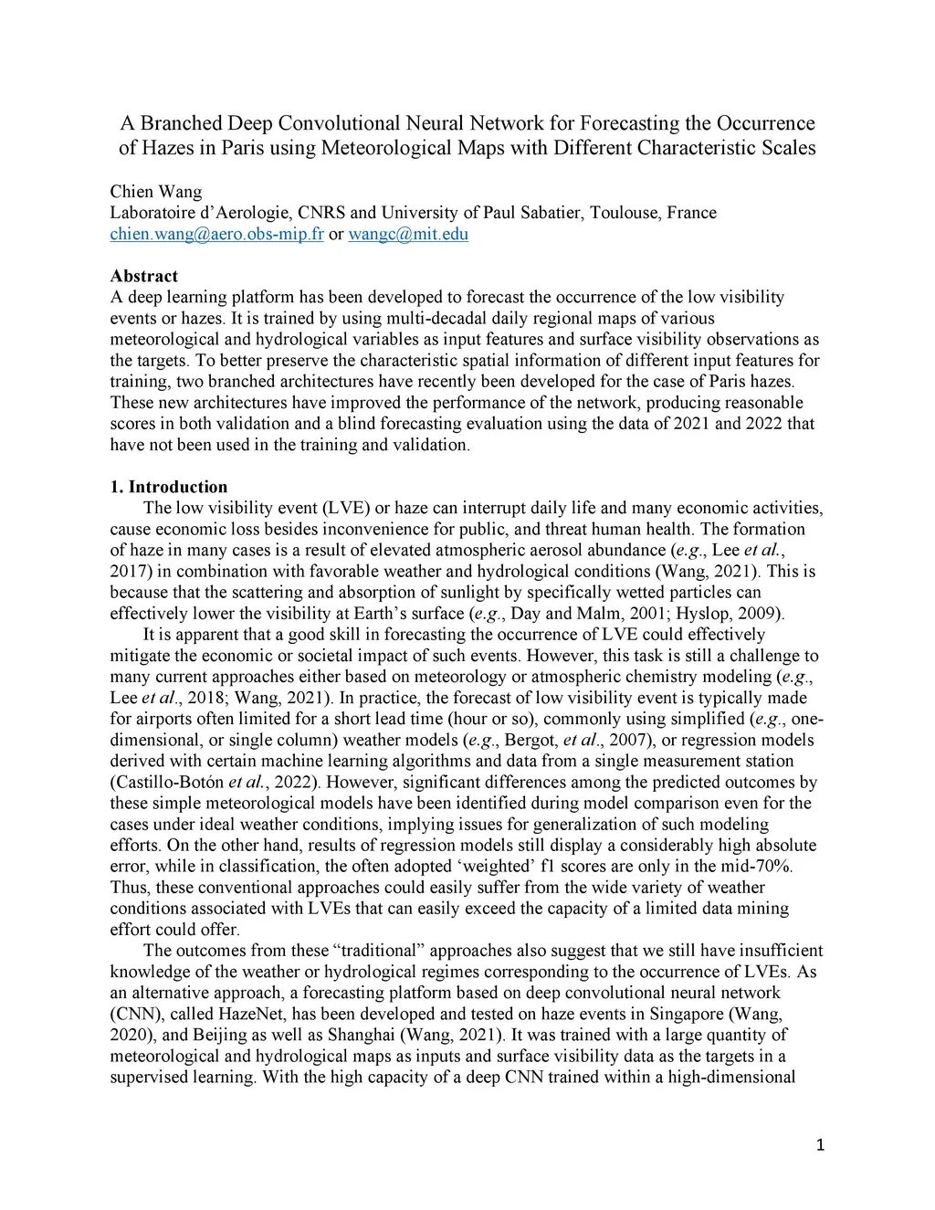 A deep learning platform has been developed to forecast the occurrence of the low visibility events or hazes. It is trained by using multi-decadal daily regional maps of various meteorological and hydrological variables as input features and surface visibility observations as the targets. To better preserve the characteristic spatial information of different input features for training, two branched architectures have recently been developed for the case of Paris hazes. These new architectures have improved the performance of the network, producing reasonable scores in both validation and a blind forecasting evaluation using the data of 2021 and 2022 that have not been used in the training and validation.