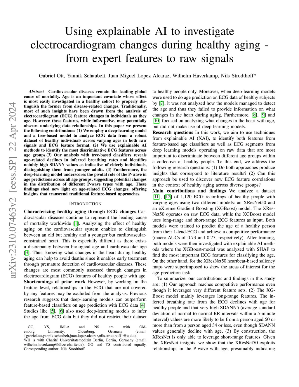Cardiovascular diseases remain the leading global cause of mortality. Age is an important covariate whose effect is most easily investigated in a healthy cohort to properly distinguish the former from disease-related changes. Traditionally, most of such insights have been drawn from the analysis of electrocardiogram (ECG) feature changes in individuals as they age. However, these features, while informative, may potentially obscure underlying data relationships. In this paper we present the following contributions: (1) We employ a deep-learning model and a tree-based model to analyze ECG data from a robust dataset of healthy individuals across varying ages in both raw signals and ECG feature format. (2) We use explainable AI methods to identify the most discriminative ECG features across age groups.(3) Our analysis with tree-based classifiers reveals age-related declines in inferred breathing rates and identifies notably high SDANN values as indicative of elderly individuals, distinguishing them from younger adults. (4) Furthermore, the deep-learning model underscores the pivotal role of the P-wave in age predictions across all age groups, suggesting potential changes in the distribution of different P-wave types with age. These findings shed new light on age-related ECG changes, offering insights that transcend traditional feature-based approaches.