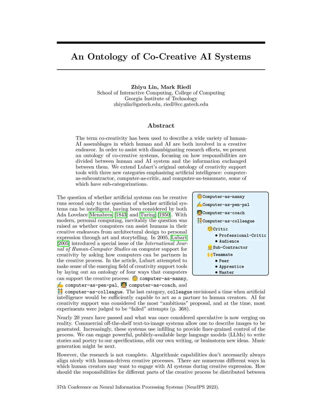 The term co-creativity has been used to describe a wide variety of human-AI assemblages in which human and AI are both involved in a creative endeavor. In order to assist with disambiguating research efforts, we present an ontology of co-creative systems, focusing on how responsibilities are divided between human and AI system and the information exchanged between them. We extend Lubart's original ontology of creativity support tools with three new categories emphasizing artificial intelligence: computer-as-subcontractor, computer-as-critic, and computer-as-teammate, some of which have sub-categorizations.