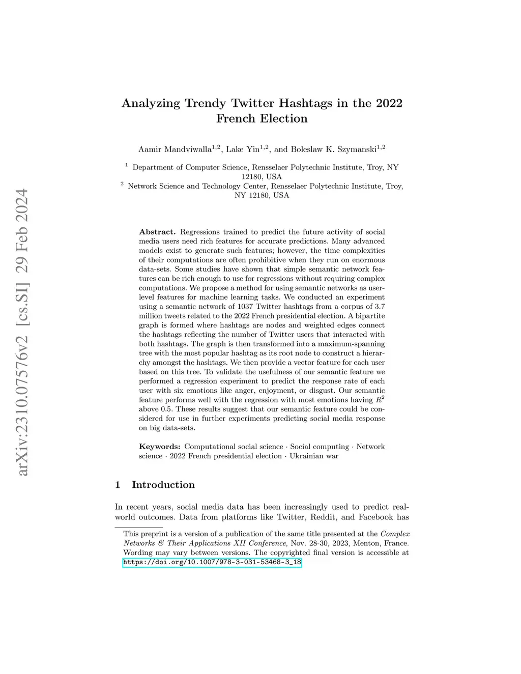 Regressions trained to predict the future activity of social media users need rich features for accurate predictions. Many advanced models exist to generate such features; however, the time complexities of their computations are often prohibitive when they run on enormous data-sets. Some studies have shown that simple semantic network features can be rich enough to use for regressions without requiring complex computations. We propose a method for using semantic networks as user-level features for machine learning tasks. We conducted an experiment using a semantic network of 1037 Twitter hashtags from a corpus of 3.7 million tweets related to the 2022 French presidential election. A bipartite graph is formed where hashtags are nodes and weighted edges connect the hashtags reflecting the number of Twitter users that interacted with both hashtags. The graph is then transformed into a maximum-spanning tree with the most popular hashtag as its root node to construct a hierarchy amongst the hashtags. We then provide a vector feature for each user based on this tree. To validate the usefulness of our semantic feature we performed a regression experiment to predict the response rate of each user with six emotions like anger, enjoyment, or disgust. Our semantic feature performs well with the regression with most emotions having above 0.5. These results suggest that our semantic feature could be considered for use in further experiments predicting social media response on big data-sets.