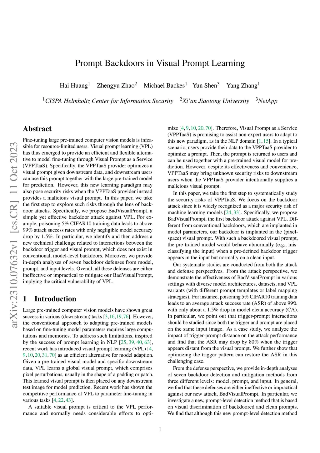 Fine-tuning large pre-trained computer vision models is infeasible for resource-limited users. Visual prompt learning (VPL) has thus emerged to provide an efficient and flexible alternative to model fine-tuning through Visual Prompt as a Service (VPPTaaS). Specifically, the VPPTaaS provider optimizes a visual prompt given downstream data, and downstream users can use this prompt together with the large pre-trained model for prediction. However, this new learning paradigm may also pose security risks when the VPPTaaS provider instead provides a malicious visual prompt. In this paper, we take the first step to explore such risks through the lens of backdoor attacks. Specifically, we propose BadVisualPrompt, a simple yet effective backdoor attack against VPL. For example, poisoning CIFAR10 training data leads to above attack success rates with only negligible model accuracy drop by . In particular, we identify and then address a new technical challenge related to interactions between the backdoor trigger and visual prompt, which does not exist in conventional, model-level backdoors. Moreover, we provide in-depth analyses of seven backdoor defenses from model, prompt, and input levels. Overall, all these defenses are either ineffective or impractical to mitigate our BadVisualPrompt, implying the critical vulnerability of VPL.