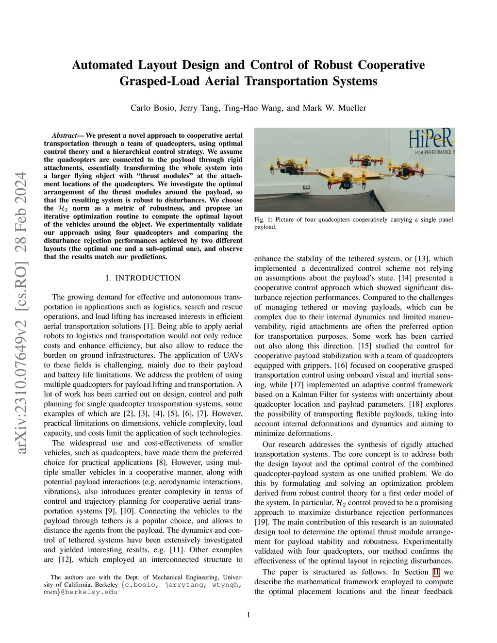 The joint optimization of physical parameters and controllers in robotic systems is challenging. This is due to the difficulties of predicting the effect that changes in physical parameters have on final performances. At the same time, physical and morphological modifications can improve robot capabilities, perhaps completely unlocking new skills and tasks. We present a novel approach to co-optimize the physical layout and the control of a cooperative aerial transportation system. The goal is to achieve the most precise and robust flight when carrying a payload. We assume the agents are connected to the payload through rigid attachments, essentially transforming the whole system into a larger flying object with ``thrust modules" at the attachment locations of the quadcopters. We investigate the optimal arrangement of the thrust modules around the payload, so that the resulting system achieves the best disturbance rejection capabilities. We propose a novel metric of robustness inspired by H2 control, and propose an algorithm to optimize the layout of the vehicles around the object and their controller altogether. We experimentally validate the effectiveness of our approach using fleets of three and four quadcopters and payloads of diverse shapes.