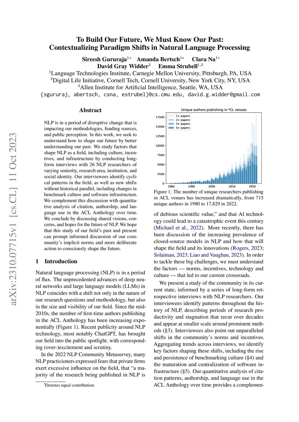 NLP is in a period of disruptive change that is impacting our methodologies, funding sources, and public perception. In this work, we seek to understand how to shape our future by better understanding our past. We study factors that shape NLP as a field, including culture, incentives, and infrastructure by conducting long-form interviews with 26 NLP researchers of varying seniority, research area, institution, and social identity. Our interviewees identify cyclical patterns in the field, as well as new shifts without historical parallel, including changes in benchmark culture and software infrastructure. We complement this discussion with quantitative analysis of citation, authorship, and language use in the ACL Anthology over time. We conclude by discussing shared visions, concerns, and hopes for the future of NLP. We hope that this study of our field's past and present can prompt informed discussion of our community's implicit norms and more deliberate action to consciously shape the future.