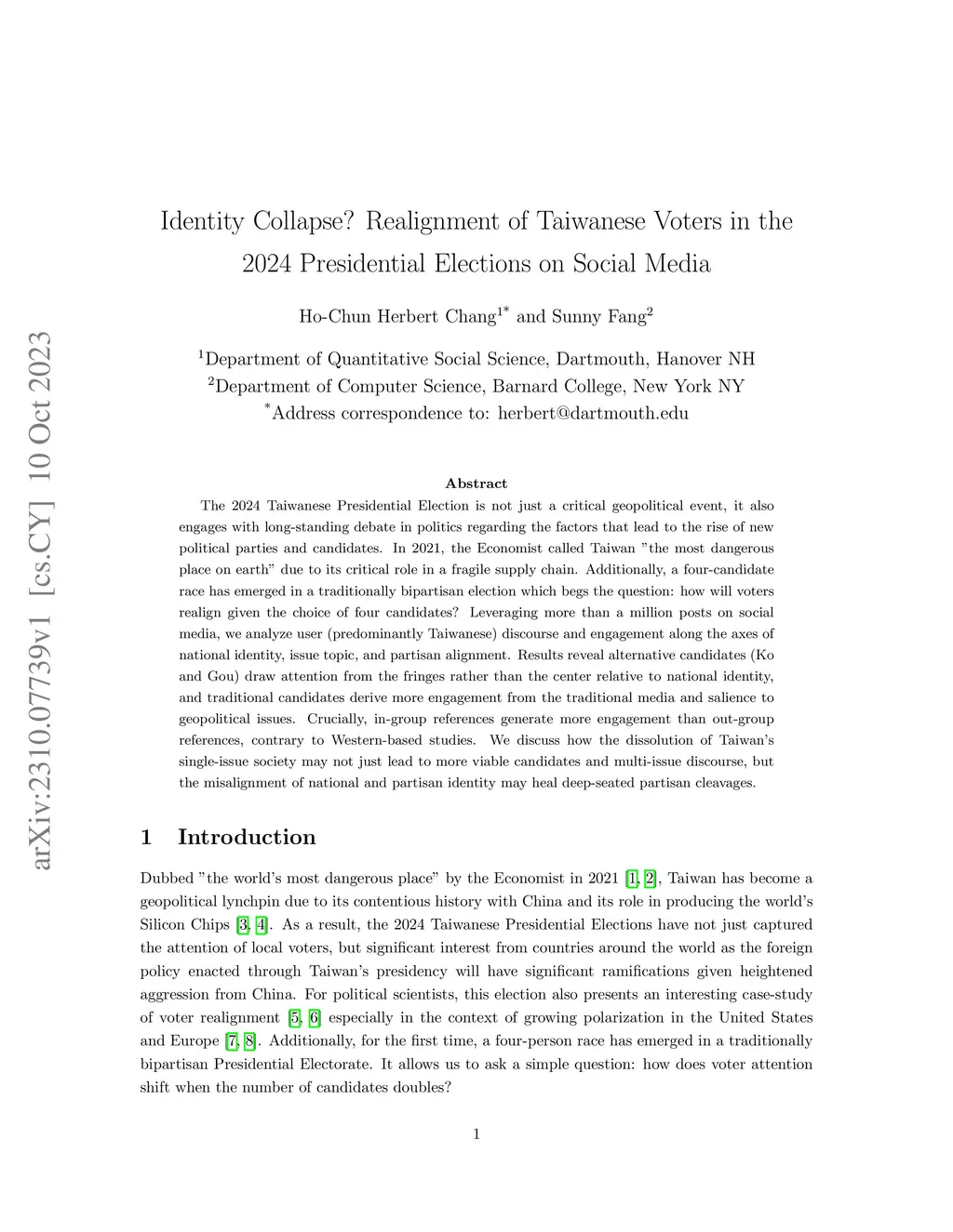 The 2024 Taiwanese Presidential Election is not just a critical geopolitical event, it also engages with long-standing debate in politics regarding the factors that lead to the rise of new political parties and candidates. In 2021, the Economist called Taiwan "the most dangerous place on earth" due to its critical role in a fragile supply chain. Additionally, a four-candidate race has emerged in a traditionally bipartisan election which begs the question: how will voters realign given the choice of four candidates? Leveraging more than a million posts on social media, we analyze user (predominantly Taiwanese) discourse and engagement along the axes of national identity, issue topic, and partisan alignment. Results reveal alternative candidates (Ko and Gou) draw attention from the fringes rather than the center relative to national identity, and traditional candidates derive more engagement from the traditional media and salience to geopolitical issues. Crucially, in-group references generate more engagement than out-group references, contrary to Western-based studies. We discuss how the dissolution of Taiwan's single-issue society may not just lead to more viable candidates and multi-issue discourse, but the misalignment of national and partisan identity may heal deep-seated partisan cleavages.