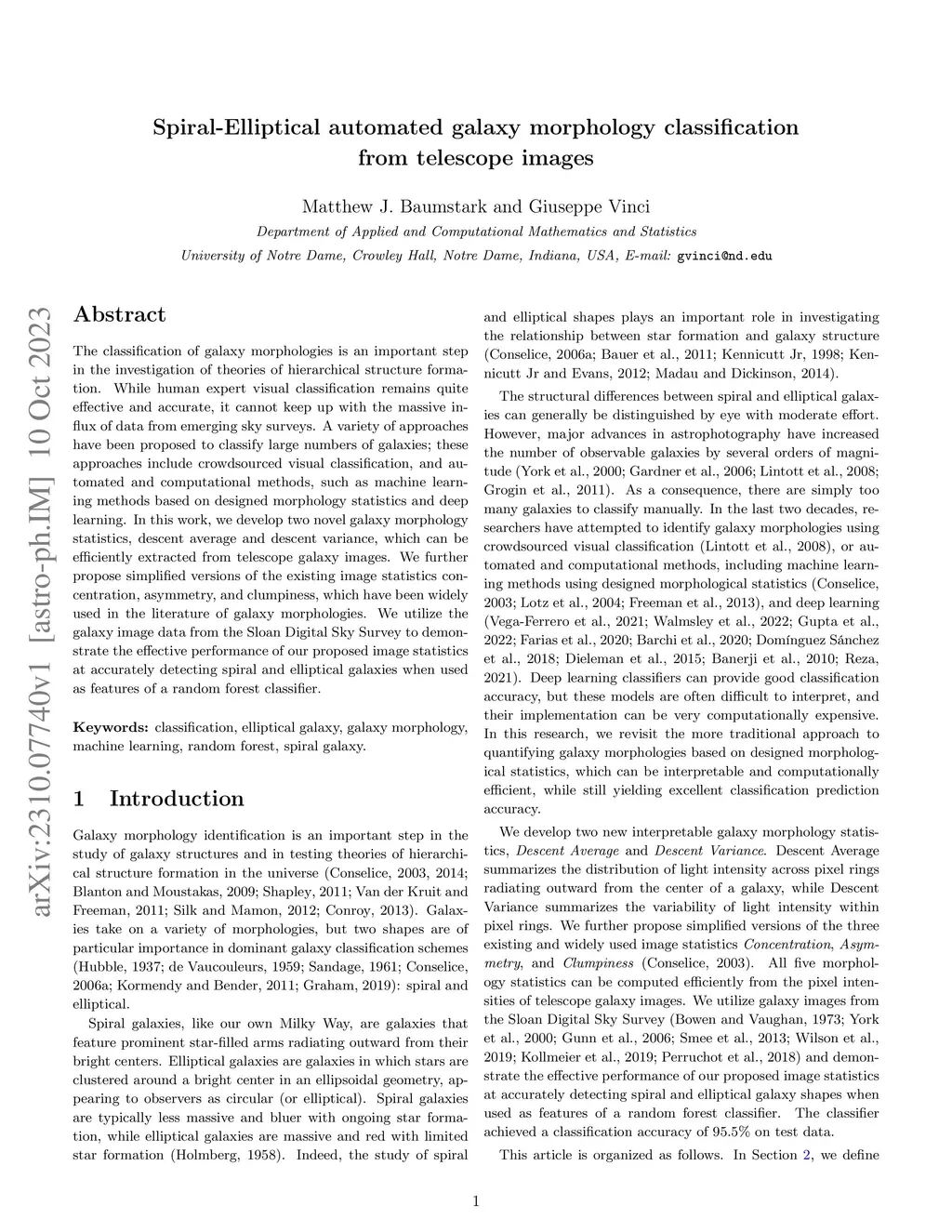 The classification of galaxy morphologies is an important step in the investigation of theories of hierarchical structure formation. While human expert visual classification remains quite effective and accurate, it cannot keep up with the massive influx of data from emerging sky surveys. A variety of approaches have been proposed to classify large numbers of galaxies; these approaches include crowdsourced visual classification, and automated and computational methods, such as machine learning methods based on designed morphology statistics and deep learning. In this work, we develop two novel galaxy morphology statistics, descent average and descent variance, which can be efficiently extracted from telescope galaxy images. We further propose simplified versions of the existing image statistics concentration, asymmetry, and clumpiness, which have been widely used in the literature of galaxy morphologies. We utilize the galaxy image data from the Sloan Digital Sky Survey to demonstrate the effective performance of our proposed image statistics at accurately detecting spiral and elliptical galaxies when used as features of a random forest classifier.