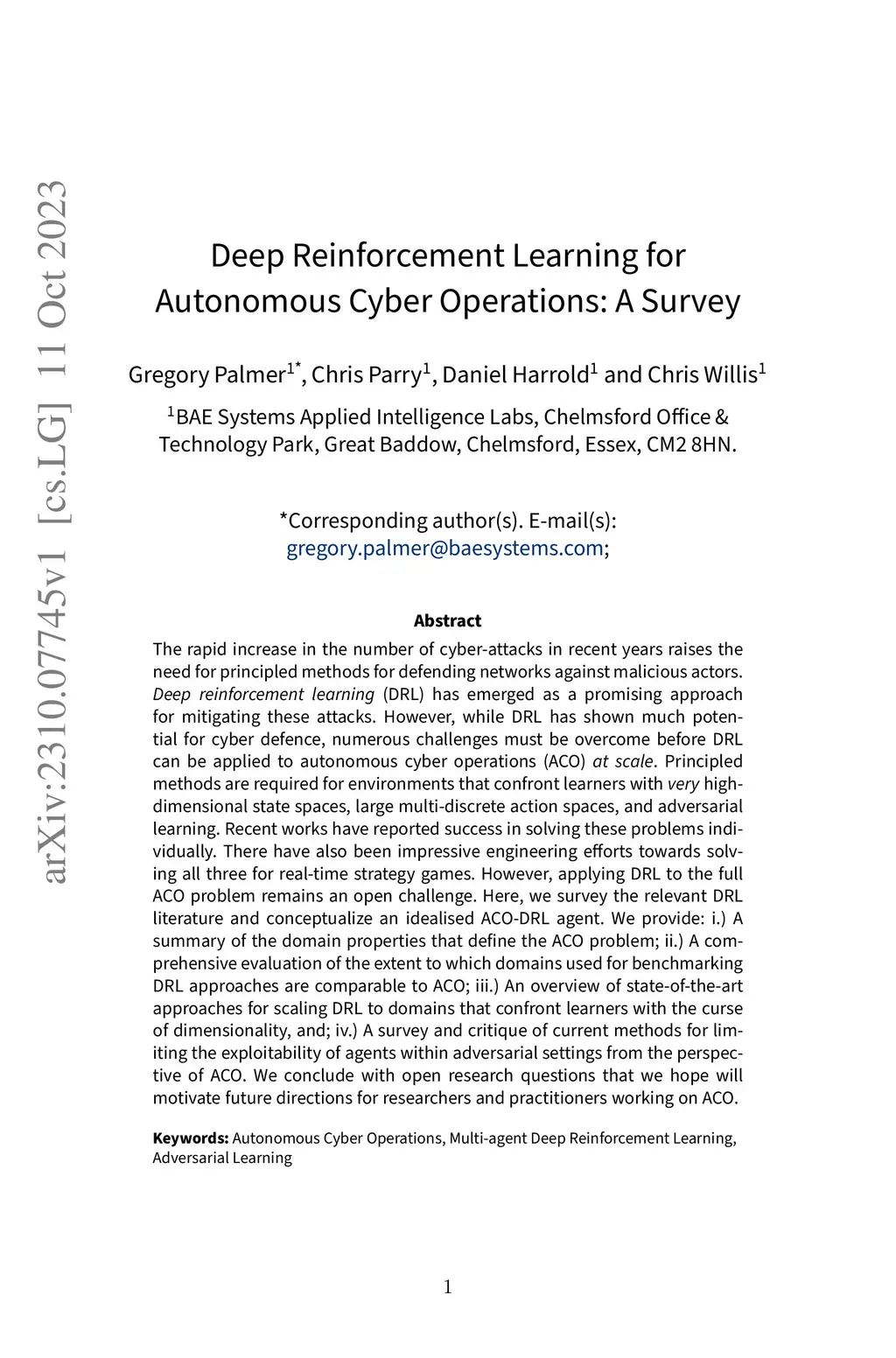Deep Reinforcement Learning for Autonomous Cyber Operations: A Survey