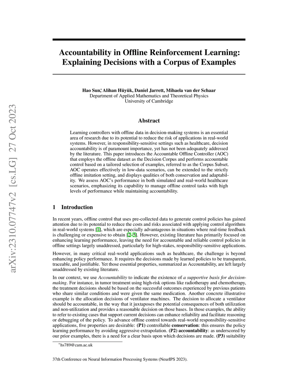 Learning controllers with offline data in decision-making systems is an essential area of research due to its potential to reduce the risk of applications in real-world systems. However, in responsibility-sensitive settings such as healthcare, decision accountability is of paramount importance, yet has not been adequately addressed by the literature. This paper introduces the Accountable Offline Controller (AOC) that employs the offline dataset as the Decision Corpus and performs accountable control based on a tailored selection of examples, referred to as the Corpus Subset. AOC operates effectively in low-data scenarios, can be extended to the strictly offline imitation setting, and displays qualities of both conservation and adaptability. We assess AOC's performance in both simulated and real-world healthcare scenarios, emphasizing its capability to manage offline control tasks with high levels of performance while maintaining accountability.