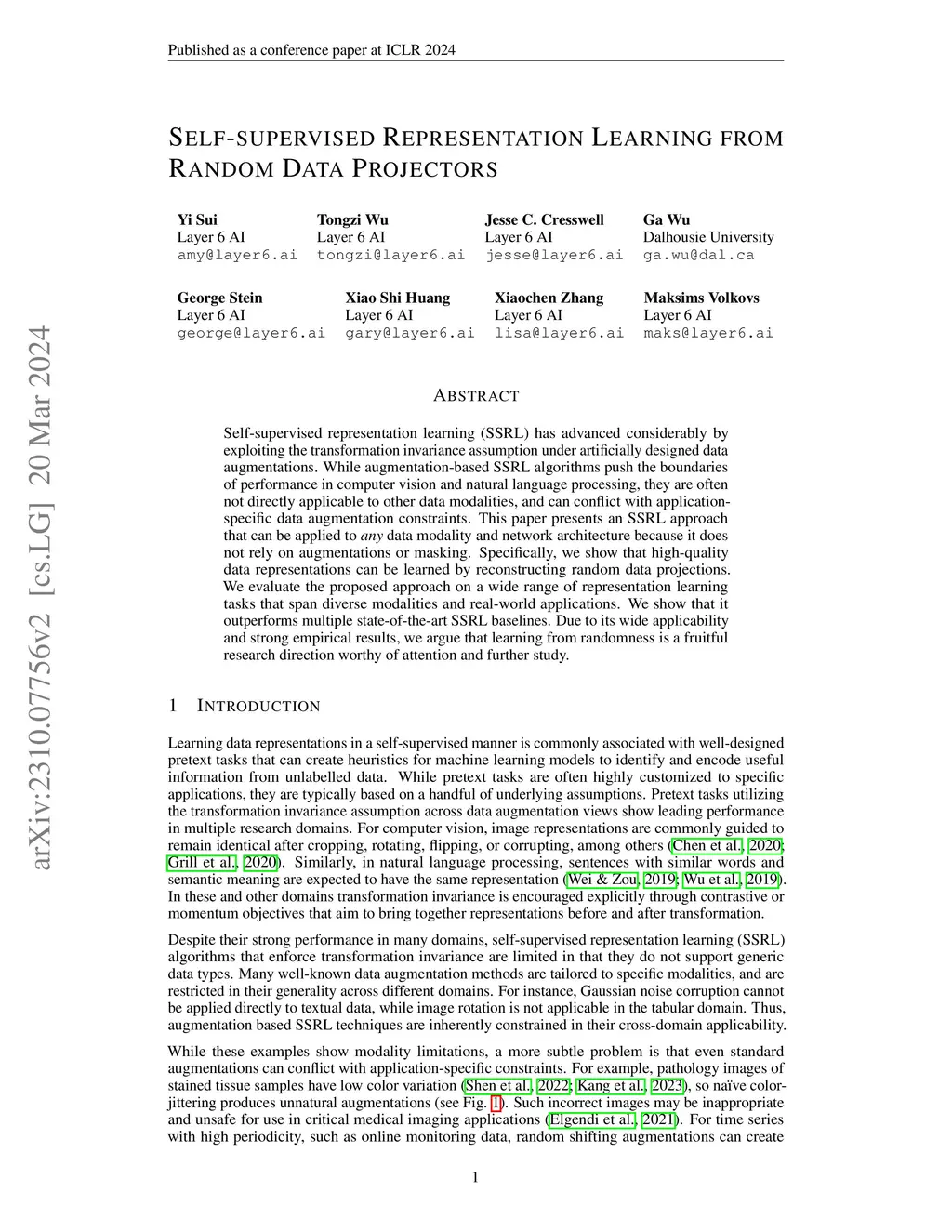 Self-supervised representation learning~(SSRL) has advanced considerably by exploiting the transformation invariance assumption under artificially designed data augmentations. While augmentation-based SSRL algorithms push the boundaries of performance in computer vision and natural language processing, they are often not directly applicable to other data modalities, and can conflict with application-specific data augmentation constraints. This paper presents an SSRL approach that can be applied to any data modality and network architecture because it does not rely on augmentations or masking. Specifically, we show that high-quality data representations can be learned by reconstructing random data projections. We evaluate the proposed approach on a wide range of representation learning tasks that span diverse modalities and real-world applications. We show that it outperforms multiple state-of-the-art SSRL baselines. Due to its wide applicability and strong empirical results, we argue that learning from randomness is a fruitful research direction worthy of attention and further study.