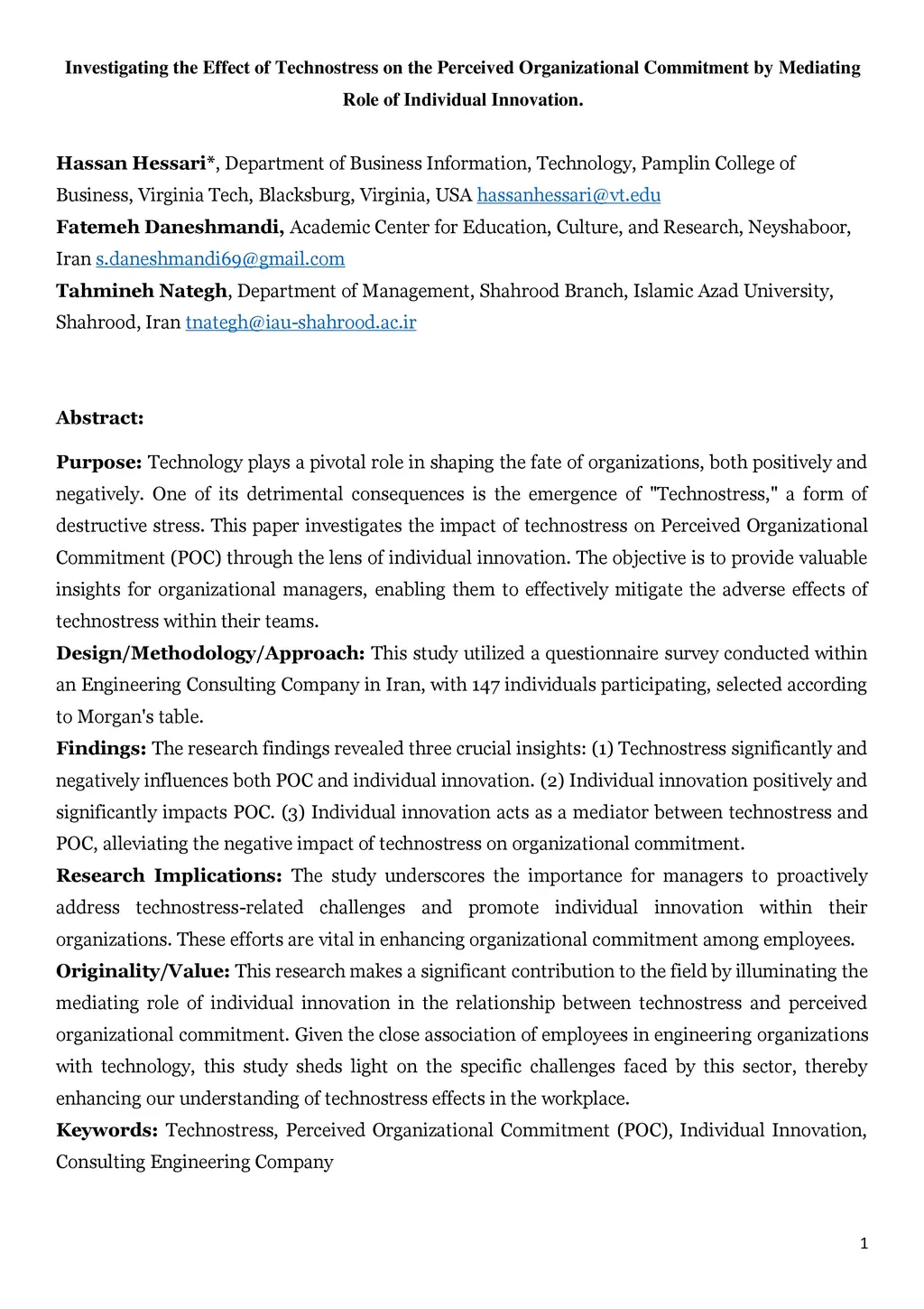 Purpose: Technology plays a pivotal role in shaping the fate of organizations, both positively and negatively. One of its detrimental consequences is the emergence of "Technostress," a form of destructive stress. This paper investigates the impact of technostress on Perceived Organizational Commitment (POC) through the lens of individual innovation. The objective is to provide valuable insights for organizational managers, enabling them to effectively mitigate the adverse effects of technostress within their teams. Design/Methodology/Approach: This study utilized a questionnaire survey conducted within an Engineering Consulting Company in Iran, with 147 individuals participating, selected according to Morgan's table. Findings: The research findings revealed three crucial insights: (1) Technostress significantly and negatively influences both POC and individual innovation. (2) Individual innovation positively and significantly impacts POC. (3) Individual innovation acts as a mediator between technostress and POC, alleviating the negative impact of technostress on organizational commitment. Research Implications: The study underscores the importance for managers to proactively address technostress-related challenges and promote individual innovation within their organizations. These efforts are vital in enhancing organizational commitment among employees. Originality/Value: This research makes a significant contribution to the field by illuminating the mediating role of individual innovation in the relationship between technostress and perceived organizational commitment. Given the close association of employees in engineering organizations with technology, this study sheds light on the specific challenges faced by this sector, thereby enhancing our understanding of technostress effects in the workplace.