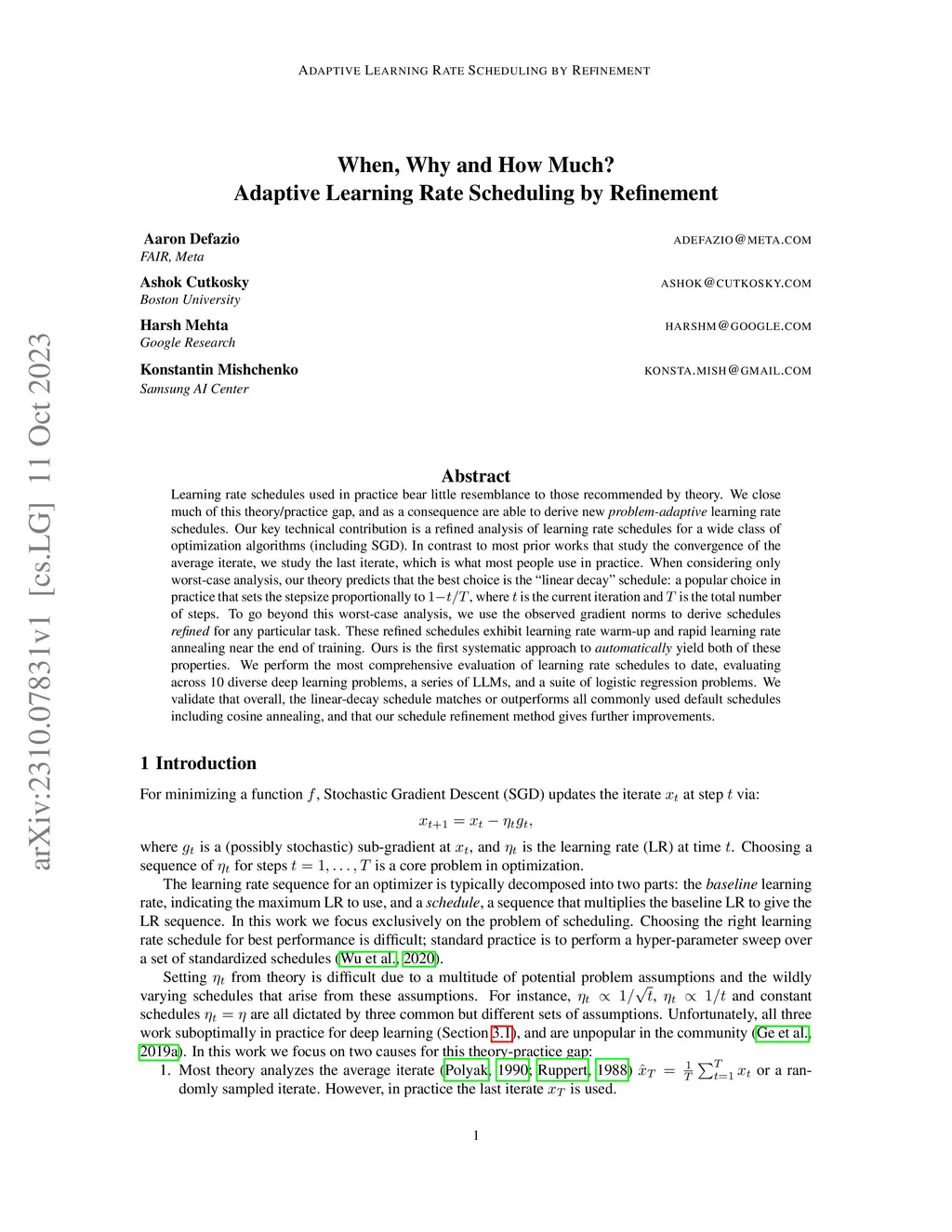 Learning rate schedules used in practice bear little resemblance to those recommended by theory. We close much of this theory/practice gap, and as a consequence are able to derive new problem-adaptive learning rate schedules. Our key technical contribution is a refined analysis of learning rate schedules for a wide class of optimization algorithms (including SGD). In contrast to most prior works that study the convergence of the average iterate, we study the last iterate, which is what most people use in practice. When considering only worst-case analysis, our theory predicts that the best choice is the linear decay schedule: a popular choice in practice that sets the stepsize proportionally to , where is the current iteration and is the total number of steps. To go beyond this worst-case analysis, we use the observed gradient norms to derive schedules refined for any particular task. These refined schedules exhibit learning rate warm-up and rapid learning rate annealing near the end of training. Ours is the first systematic approach to automatically yield both of these properties. We perform the most comprehensive evaluation of learning rate schedules to date, evaluating across 10 diverse deep learning problems, a series of LLMs, and a suite of logistic regression problems. We validate that overall, the linear-decay schedule matches or outperforms all commonly used default schedules including cosine annealing, and that our schedule refinement method gives further improvements.